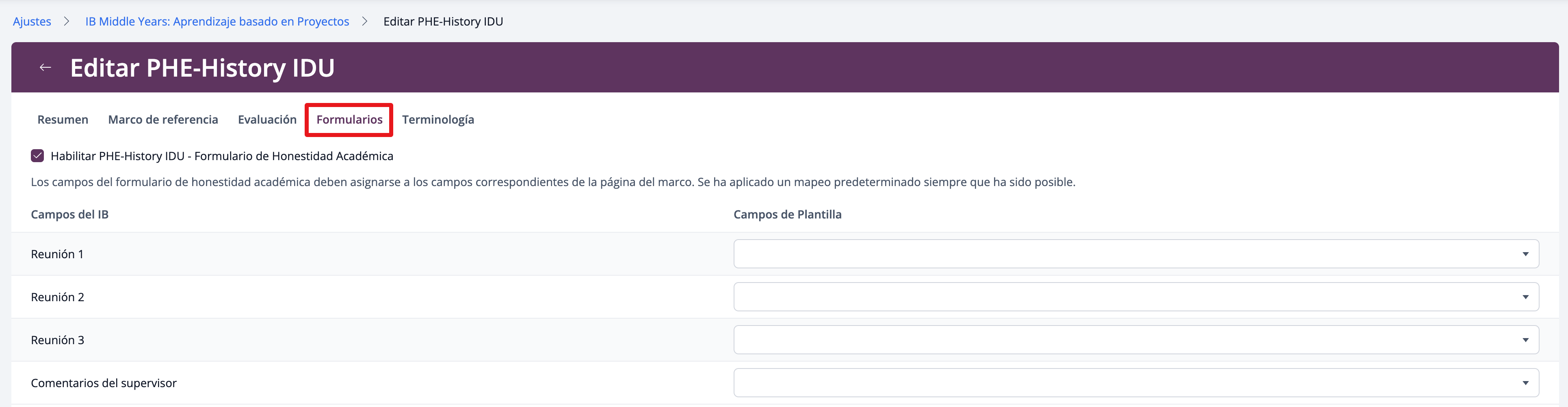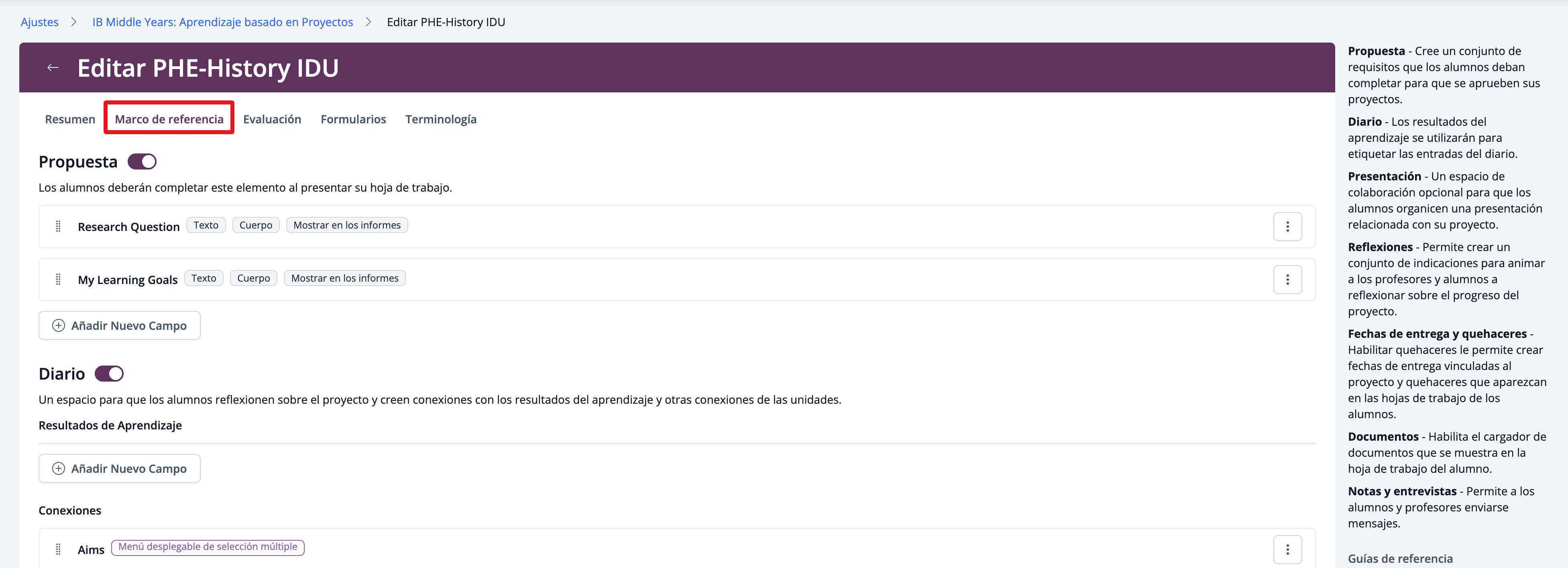 Utiliza la pestaña Marco de Referencia de la plantilla para habilitar y configurar las secciones de Propuesta, Diario, Presentación, Reflexiones, Fechas límite y Tareas pendientes, Documentos del proyecto, Notas y Entrevistas en la Hoja de trabajo del Proyecto. Por defecto, los Proyectos Interdisciplinarios vienen preconfigurados con las opciones de Propuesta y Diario.