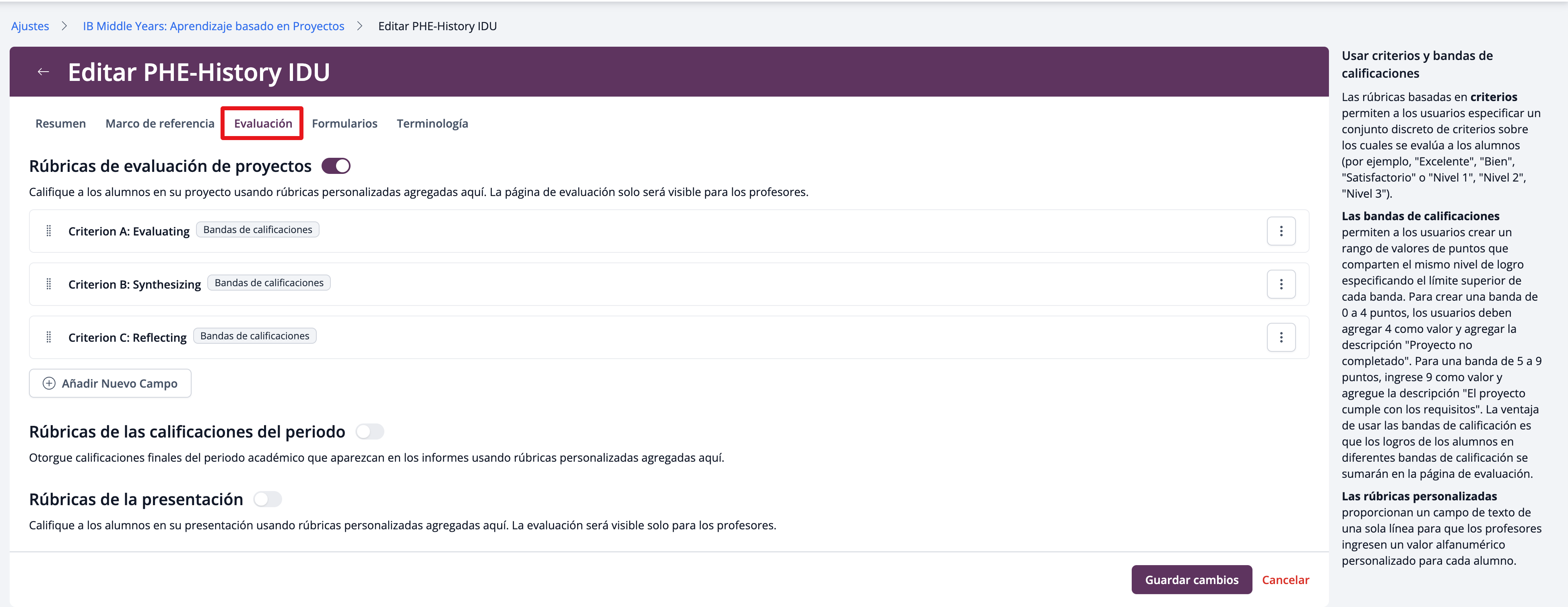 La sección de Evaluación de las plantillas de Proyecto Interdisciplinario muestra los Criterios de Evaluación Interdisciplinarios habilitados para la evaluación. Opcionalmente, se pueden añadir Rúbricas de Evaluación de Proyecto adicionales o habilitar rúbricas de Calificaciones por Periodo para evaluar este proyecto con las Calificaciones por Periodo. Si la Presentación está habilitada para la plantilla, las escuelas también pueden configurar Rúbricas de Presentación para el proyecto.