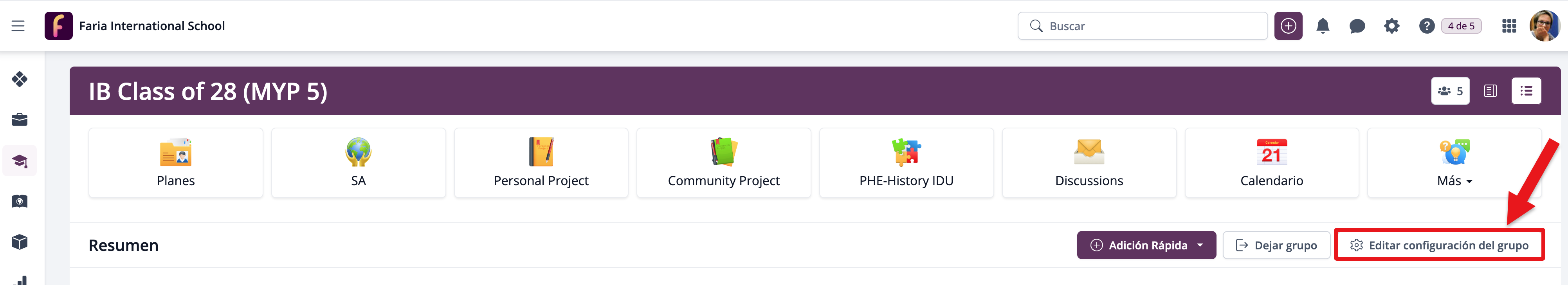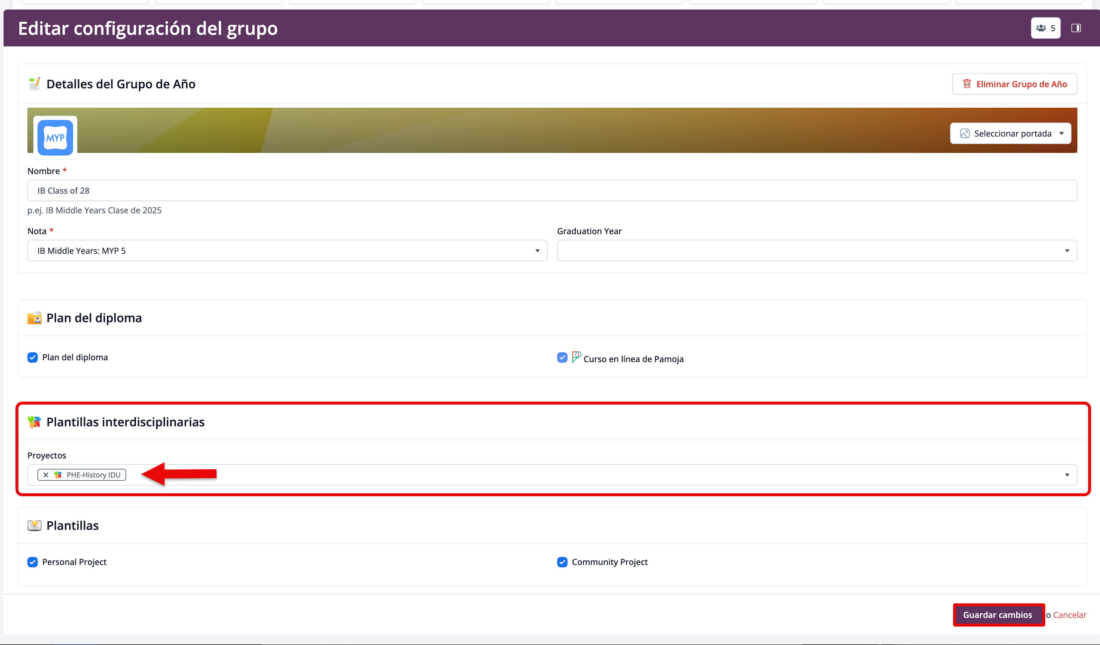 Todas las plantillas de Proyectos Interdisciplinarios deben habilitarse en la página Editar configuración del grupo en los Grupos de Año. Esto añadirá una sección para el Proyecto al Grupo de Año para que los estudiantes y profesores puedan acceder.