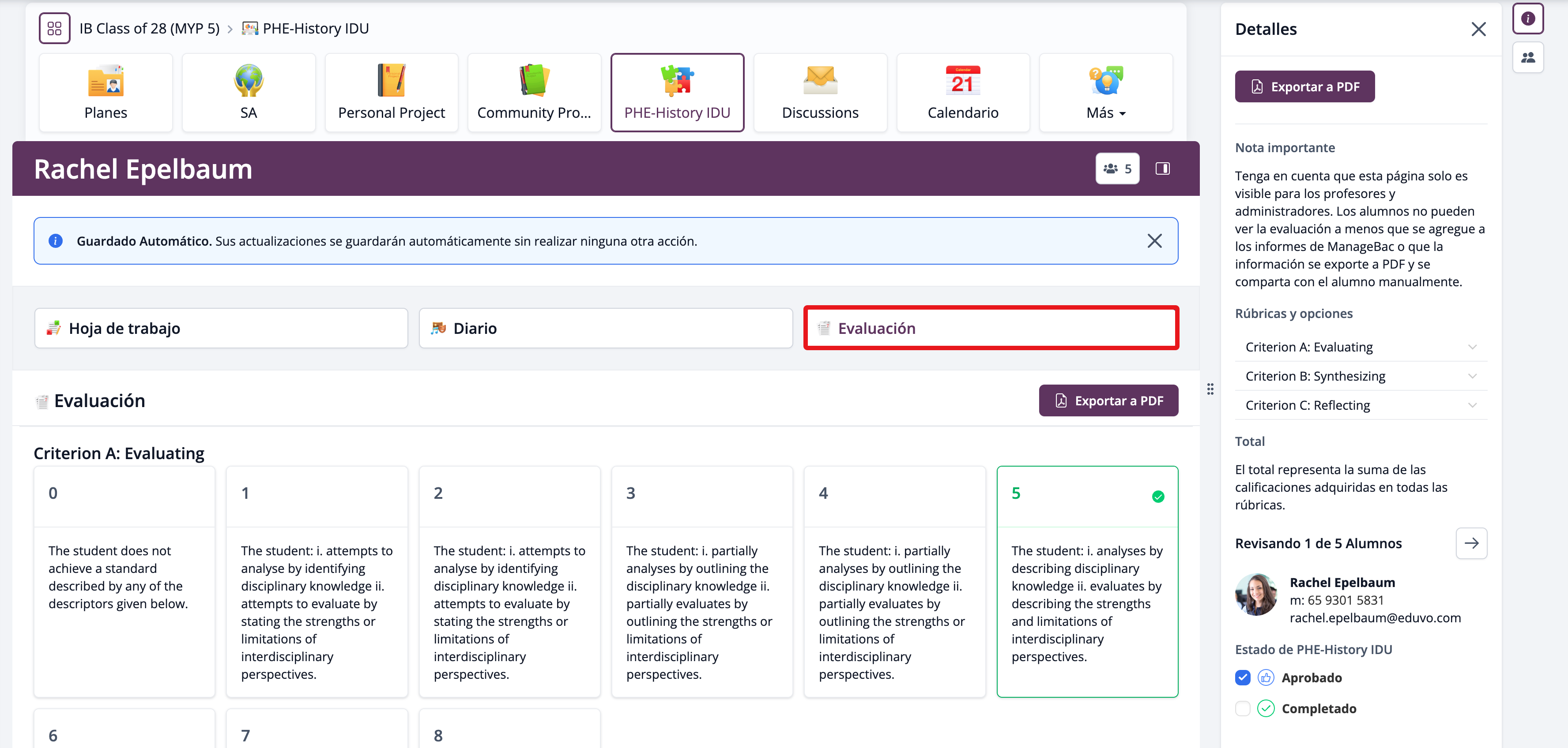 Los Asesores de Proyectos y los profesores pueden utilizar la pestaña de Evaluación de la plantilla del Proyecto Interdisciplinario para evaluar a los estudiantes con los Criterios Interdisciplinarios.
