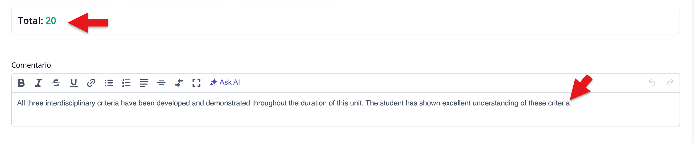 Una vez que el proyecto se evalúa con los Criterios, se muestra un sumatorio en la parte inferior de la página y el profesor puede dejar un Comentario general para el IDU.