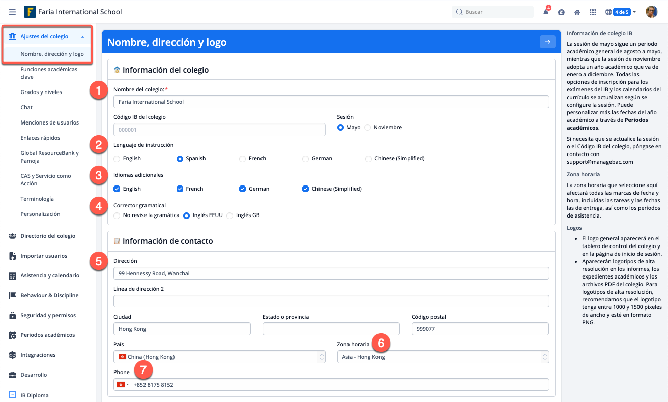 A través de Ajustes > Ajustes del colegio > Nombre, dirección y logo, puedes configurar los ajustes generales de tu cuenta ManageBac+:
