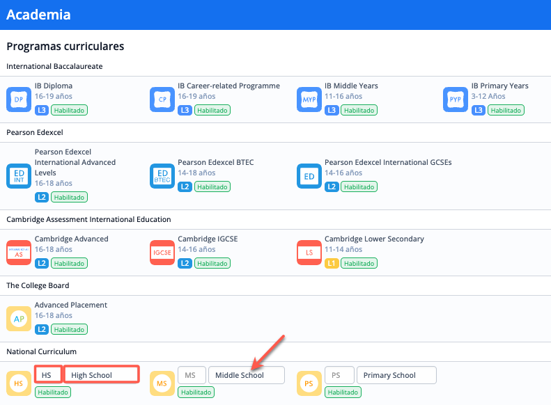Programas CurricularesA través de Ajustes > Ajustes del colegio > Funciones académicas clave, puedes ver los programas activados y personalizar los nombres y etiquetas de los programas del Currículo Nacional.