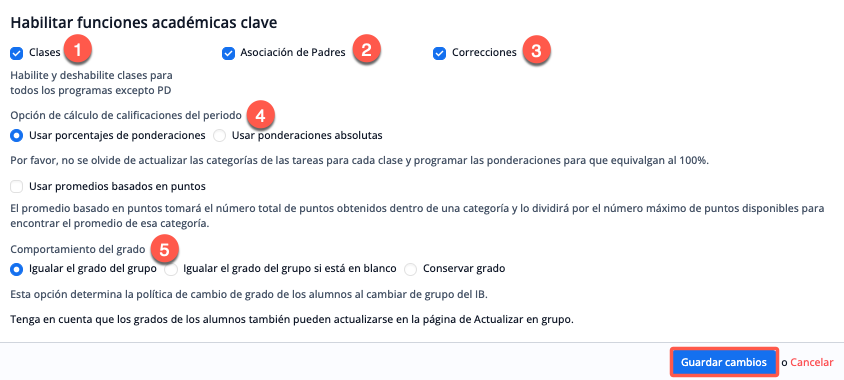 - Selecciona tu opción de cálculo de calificaciones del periodo. Lee más acerca de Configurar los Cálculos del Libro de Calificaciones.