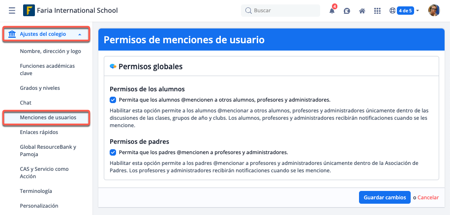 A través de Ajustes > Ajustes del colegio > Global ResourceBank y Pamoja, habilita las importaciones o contribuciones al Global ResourceBank y solicita o cancela las integraciones con las soluciones de Aprendizaje Online de Pamoja.