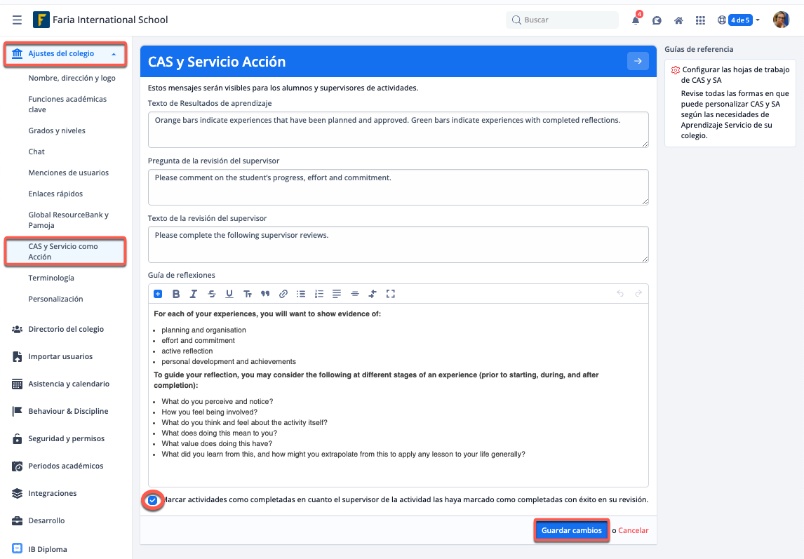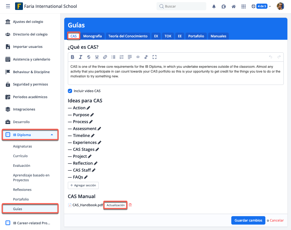 A través de las pestañas de aprendizaje por servicios (CAS/SA/SL), aprendizaje básico (EE, TOK) o aprendizaje basado en proyectos (PP/CP/PBL), puedes cargar guías relevantes, así como personalizar la orientación para tus alumnos.