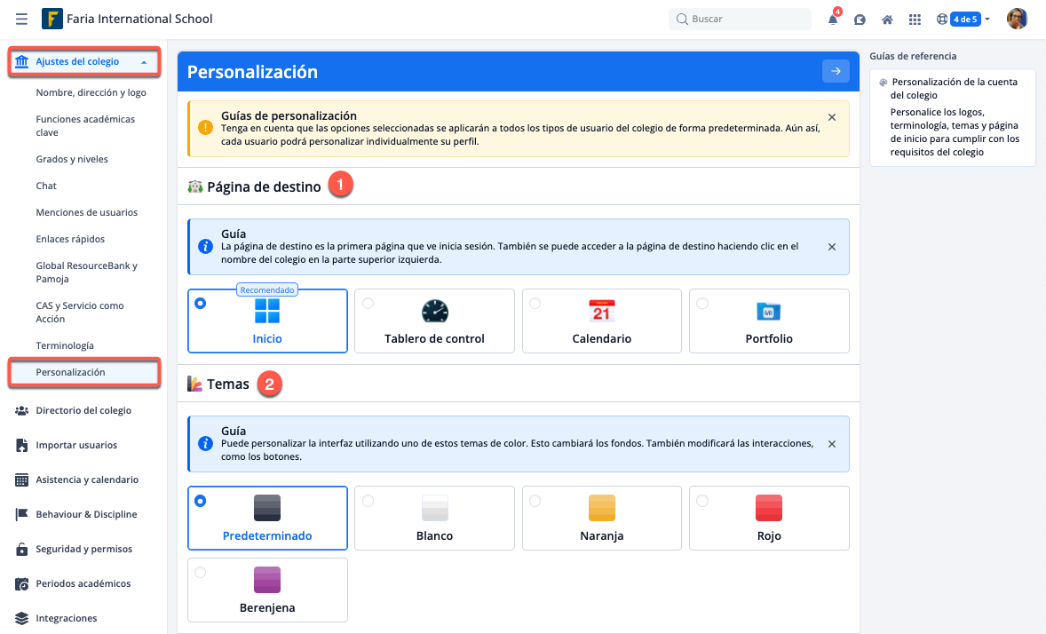 Establece la Página de Destino (1) y el Tema (2) predeterminado para todos los usuarios a través de Ajustes > Ajustes del colegio > Personalización.