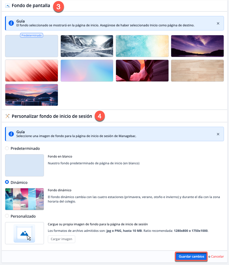 A través de Ajustes > Ajustes del colegio > Personalización, puedes establecer un fondo de pantalla predeterminado para el menú de inicio (3) o configurar el fondo de la página de inicio de sesión del centro (4).