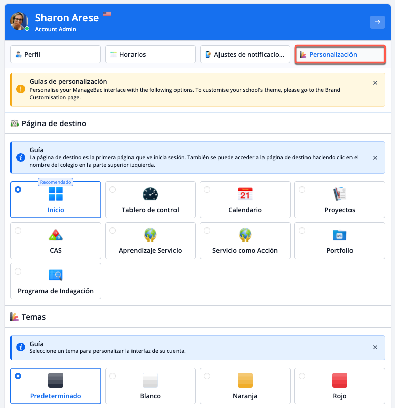 A través de Perfil > PersonalizaciónLos usuarios pueden cambiar la página de inicio, el tema, el menú de navegación izquierdo y el fondo de pantalla de sus cuentas ManageBac+ a través de la página de Personalización del perfil.