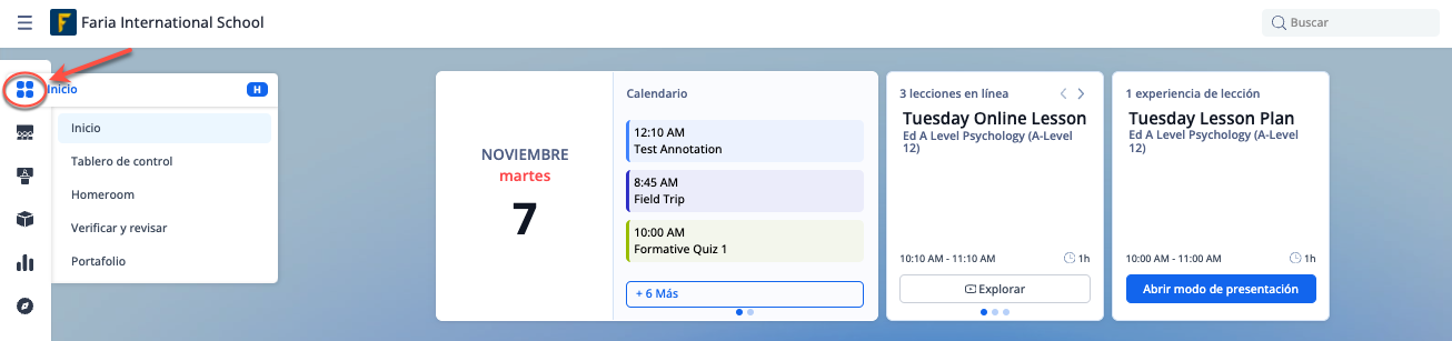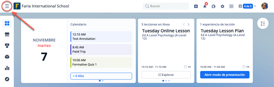 Es posible ocultar el menú izquierdo en cualquier pantalla de ManageBac+ para tener una vista más completa de las opciones disponibles en la pantalla actual.