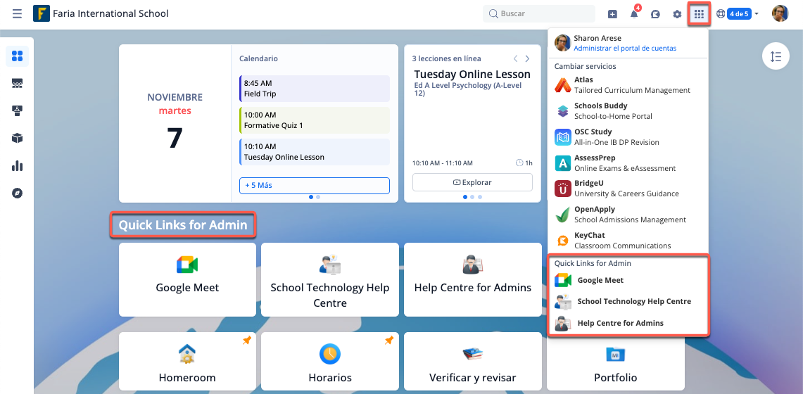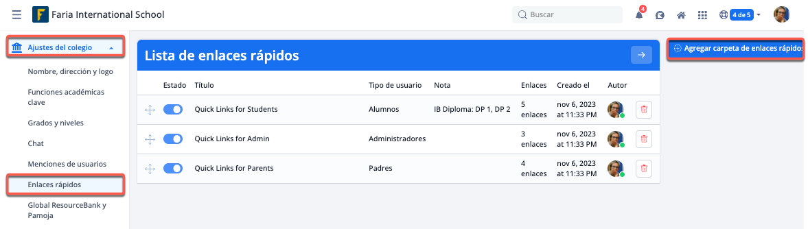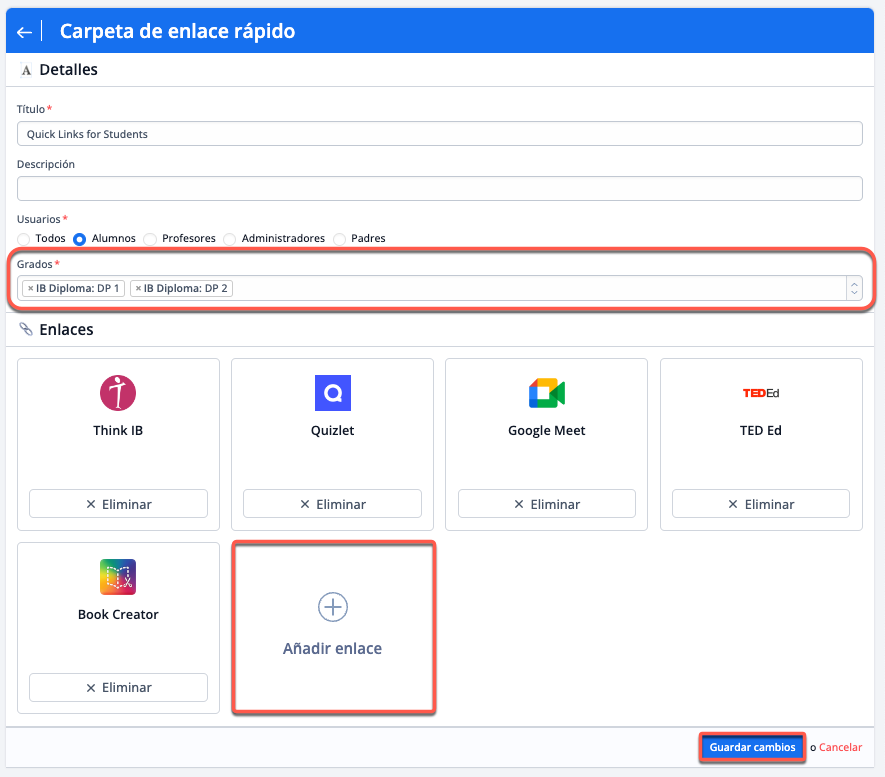 Utiliza la página de Enlaces Rápidos para crear carpetas de Enlaces personalizadas o configurar qué Enlaces Rápidos estarán disponibles en el Menú Inicio para Alumnos, Profesores y Padres.