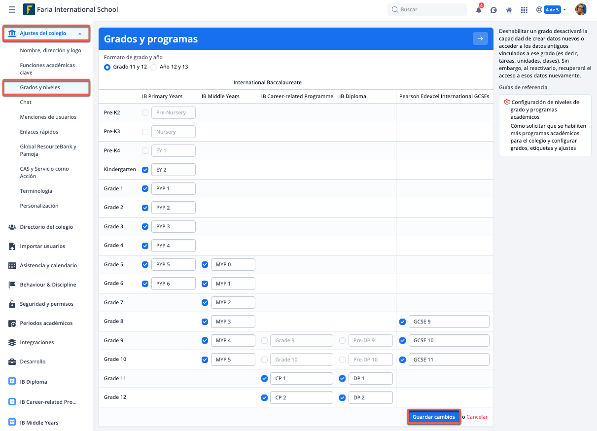Pulsa Grados y Niveles para personalizar las etiquetas de tus niveles de grado, ya que pueden llamarse de forma diferente en tu escuela (por ejemplo, Grado 11 y 12). También puedes deshabilitar o habilitar el número de niveles de grado que desees en ManageBac+.