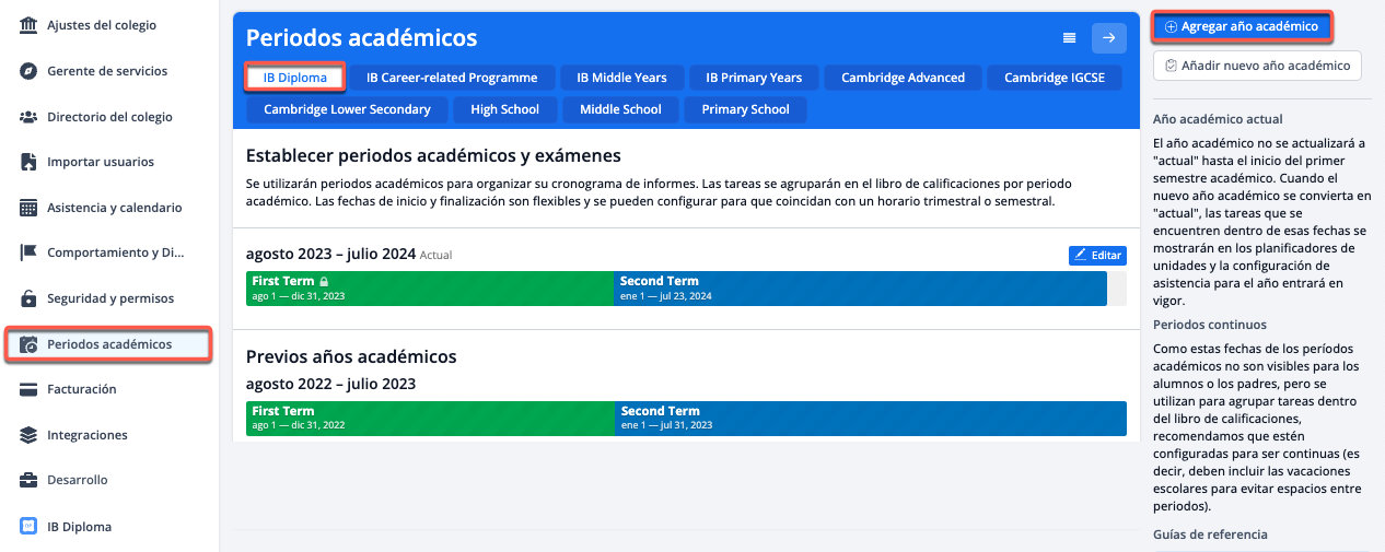 Ve a Ajustes > Periodos académicos > selecciona Programa > pulsa + Añadir año académico.