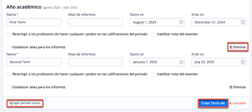 Al añadir un Año Académico, configura el nombre y las fechas de Inicio y Fin de cada periodo. También puedes Añadir periodo nuevo o Eliminar para añadir o eliminar periodos de los existentes en este pantalla.