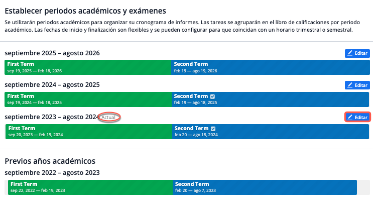 Nota: Un año académico no se actualizará a "Actual" hasta el inicio del primer periodo académico de ese año académico. Cuando el nuevo año académico se convierta en "Actual", las tareas que se encuentren dentro de esas fechas se mostrarán en los planificadores de unidades y entrarán en vigor los ajustes de asistencia para el año académico.