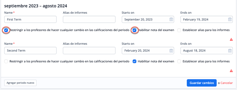 Consejo: Como las fechas de los periodos académicos no son visibles para los alumnos ni para los padres, pero se utilizan para agrupar tareas dentro del libro de calificaciones, recomendamos que se configuren para que sean continuas (es decir, deben incluir sus vacaciones escolares para evitar huecos entre periodos).