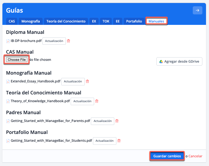 Para cargar un manual, pulsa Choose File bajo el título correspondiente. Selecciona el manual de su ordenador y cárgalo. Para sustituir un manual ya existente, pulsa en Actualizar, o pulsa en el icono de la papelera para Eliminarlo. Cuando hayas terminado de elegir tus manuales, pulsa Guardar cambios en la parte inferior de la página.