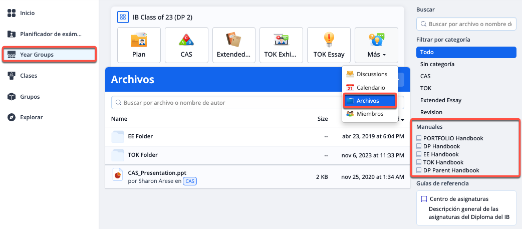 Los alumnos pueden navegar hasta Year Groups > Archivos, y cualquier manual académico que haya sido cargado para su programa respectivo, aparecerá como enlace en la parte derecha bajo Manuales. Para descargar un manual, pulsa sobre él.
