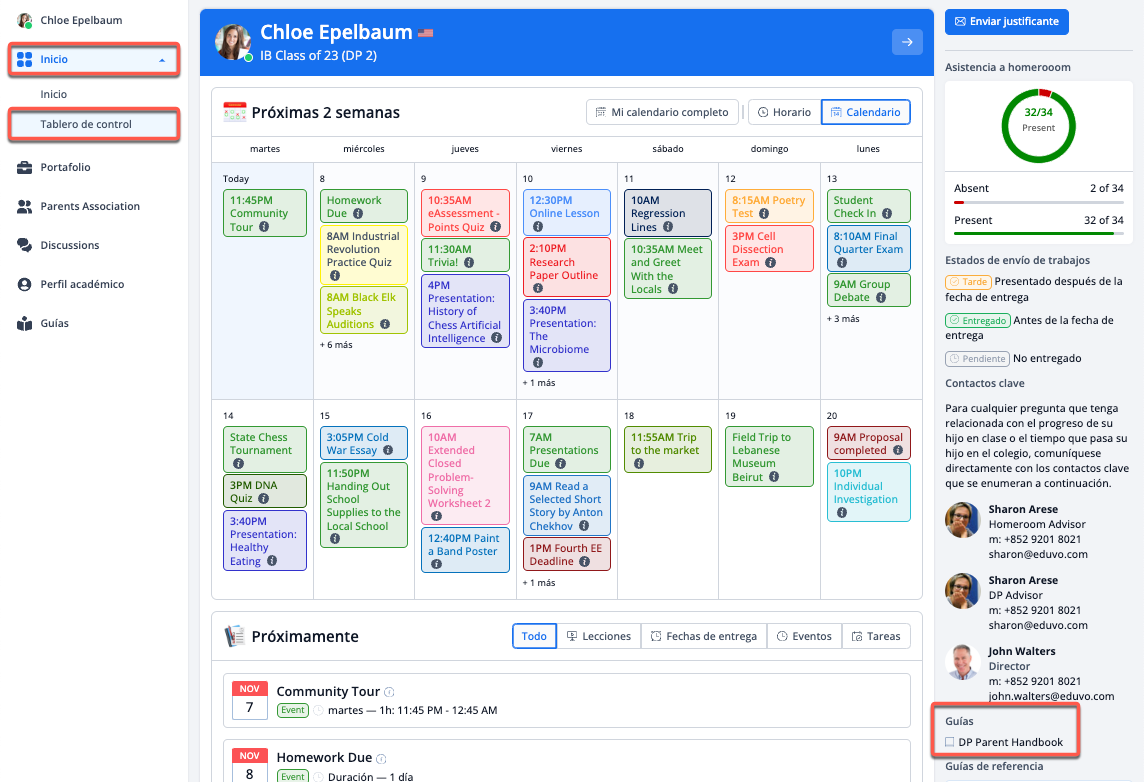 Cuando los padres inician sesión en ManageBac+, pueden ver si se ha cargado un manual para padres para el programa de su hijo desde su Tablero de control. Aparecerá como un enlace en la sección de Guías en el lado derecho. Para descargar un manual, pulsa sobre él.
