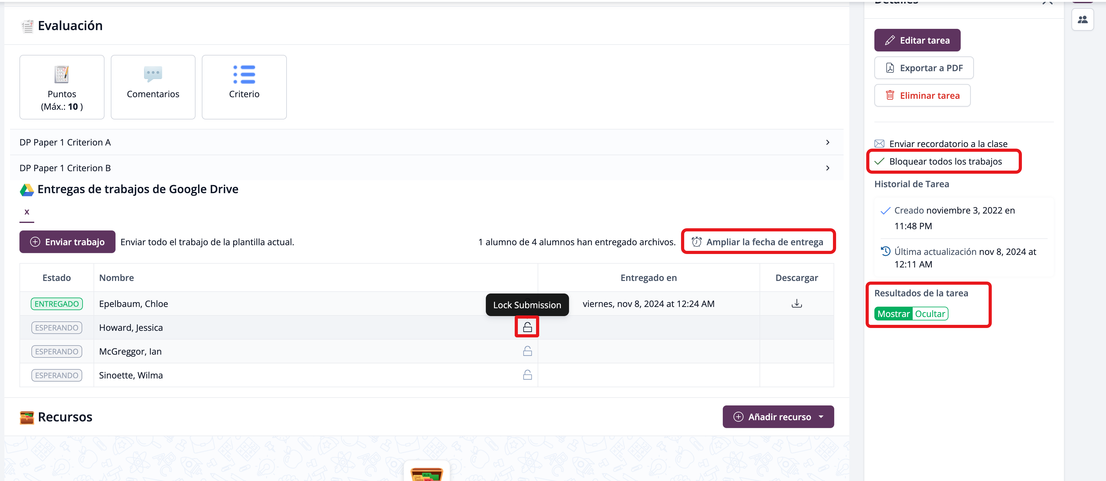Los profesores pueden bloquear las entregas individuales de los estudiantes de forma independiente al estado de entrega de la plantilla de GDoc usando el ícono de candado.