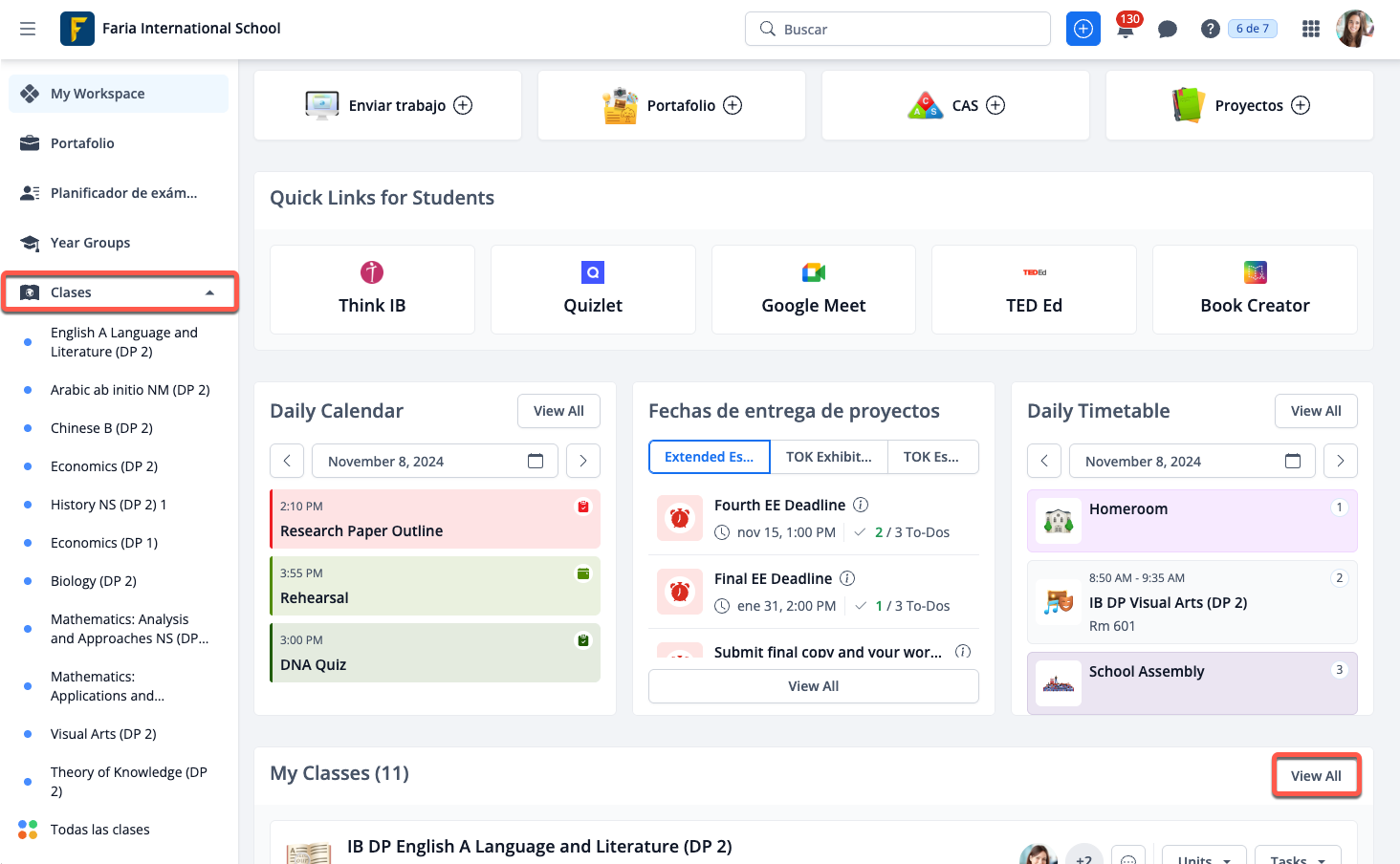 Selecciona la pestaña Clases para ver el menú desplegable con todas las clases de las que formas parte.