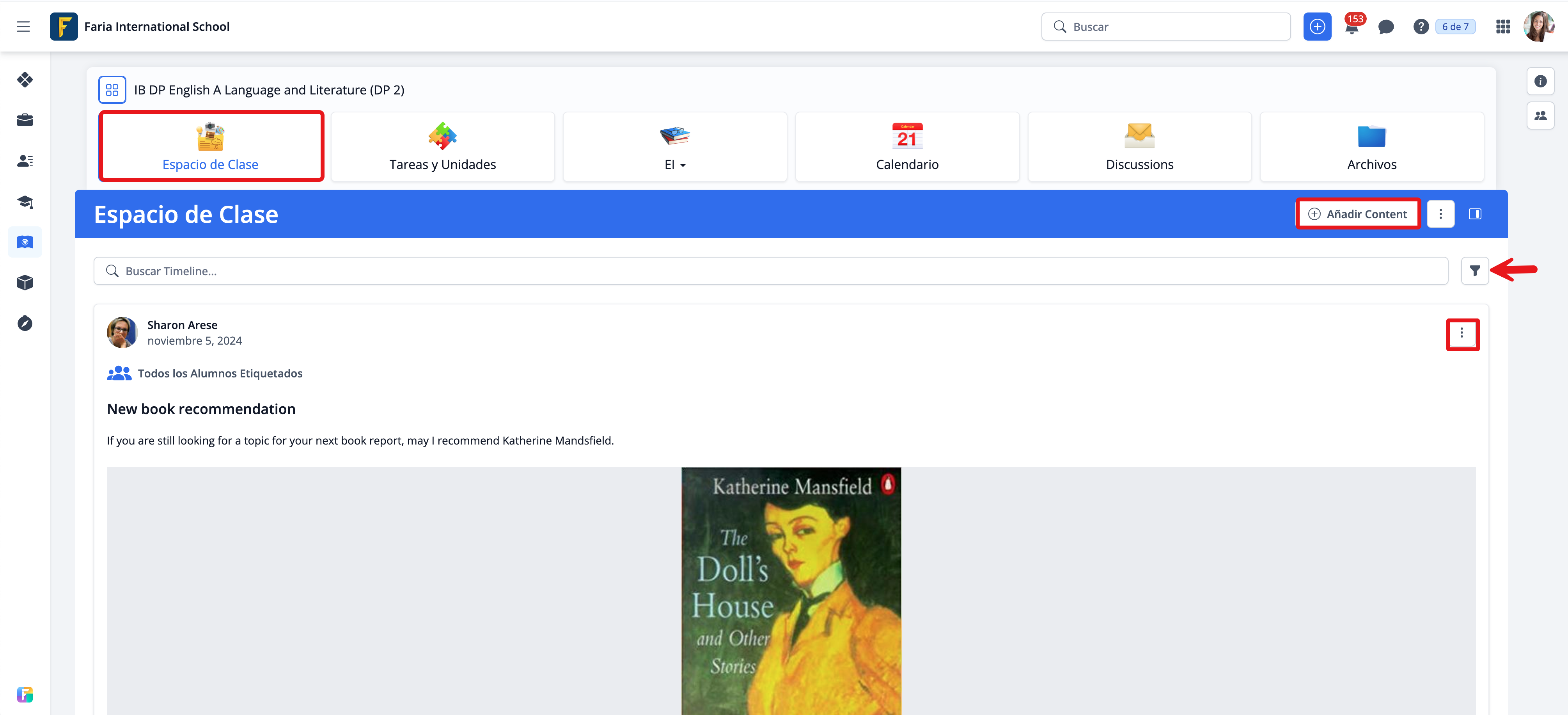 Usa los menús de tres puntos para interactuar con publicaciones individuales o filtra el Espacio de Clase para ver las entradas más relevantes según tu necesidad.