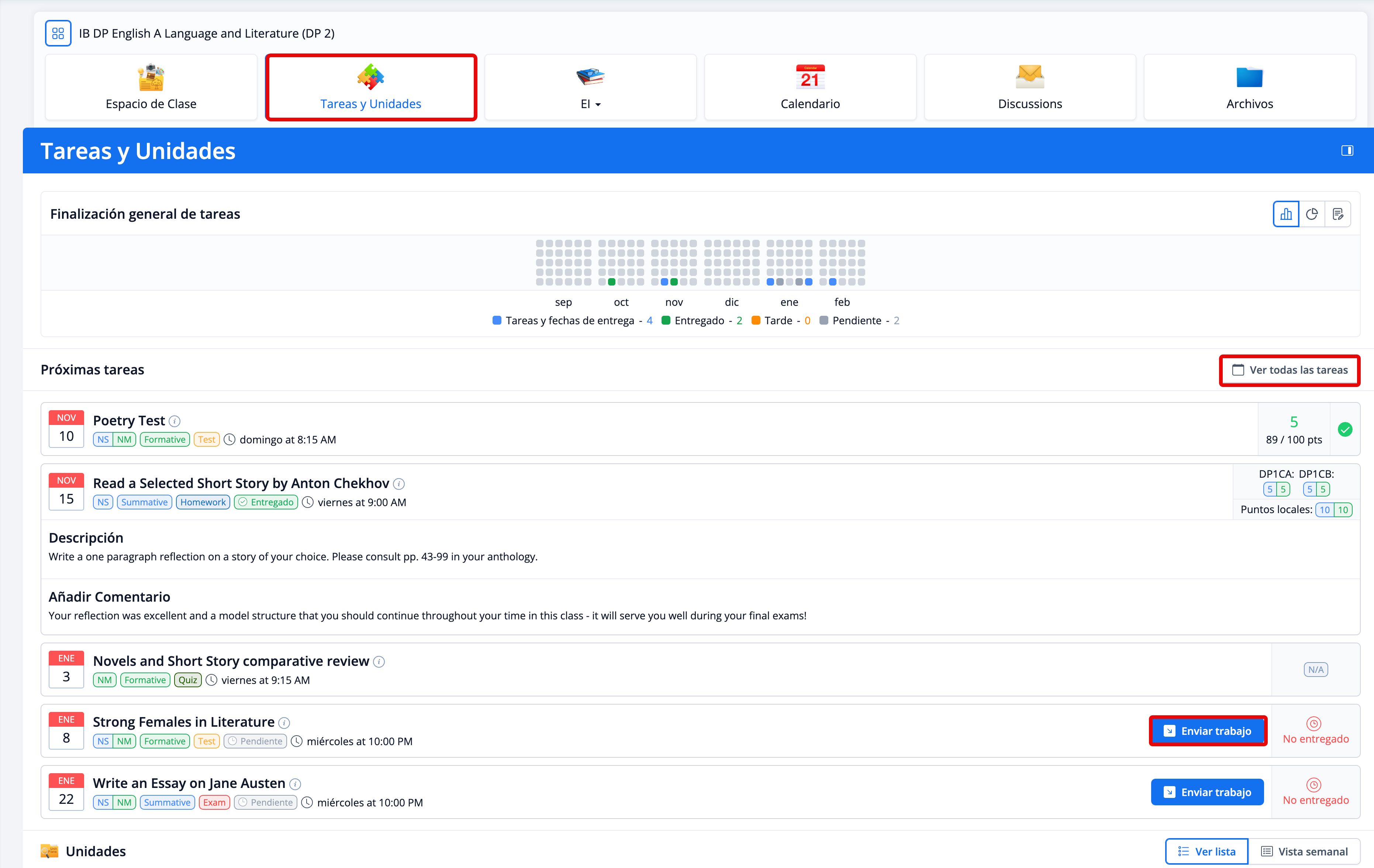 Haz clic en una clase para acceder a la Vista general de la Clase, donde podrás ver las tareas, unidades, mensajes, archivos y un calendario con las fechas de entrega.