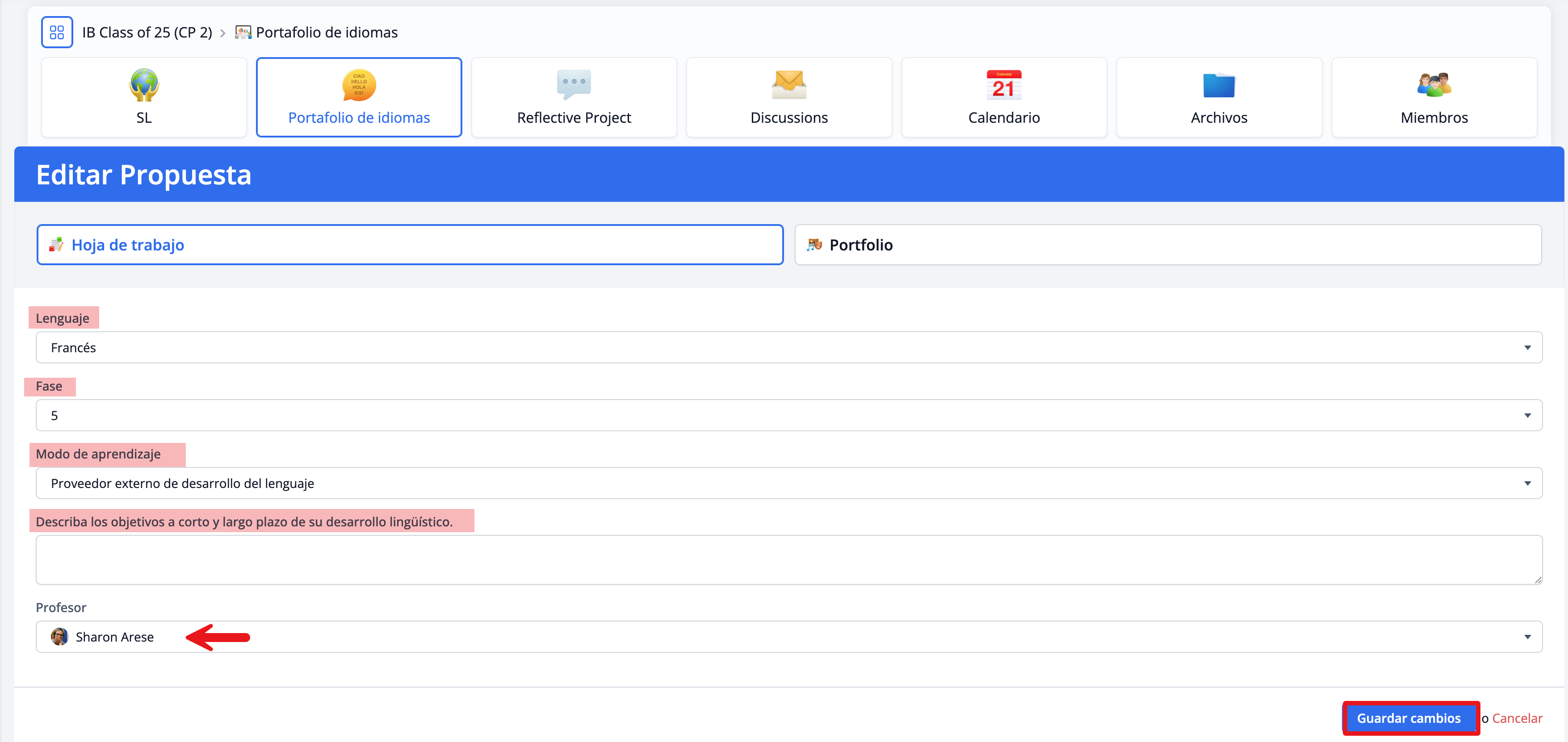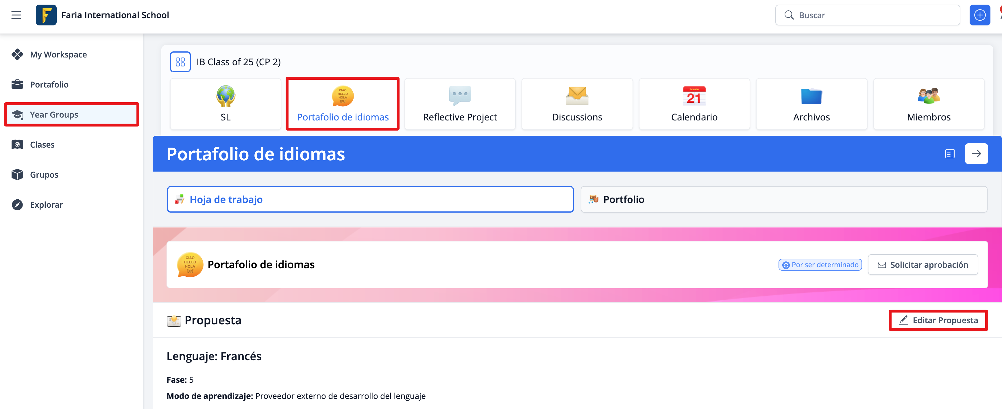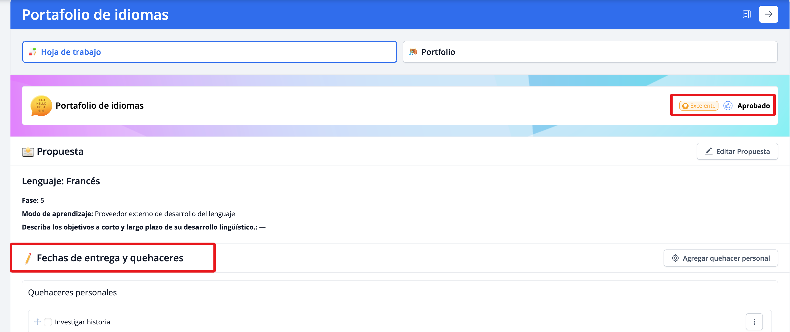 Puedes configurar tu hoja de trabajo de Aprendizaje Basado en Proyectos haciendo clic en Portafolio de Idiomas > Editar propuesta.
