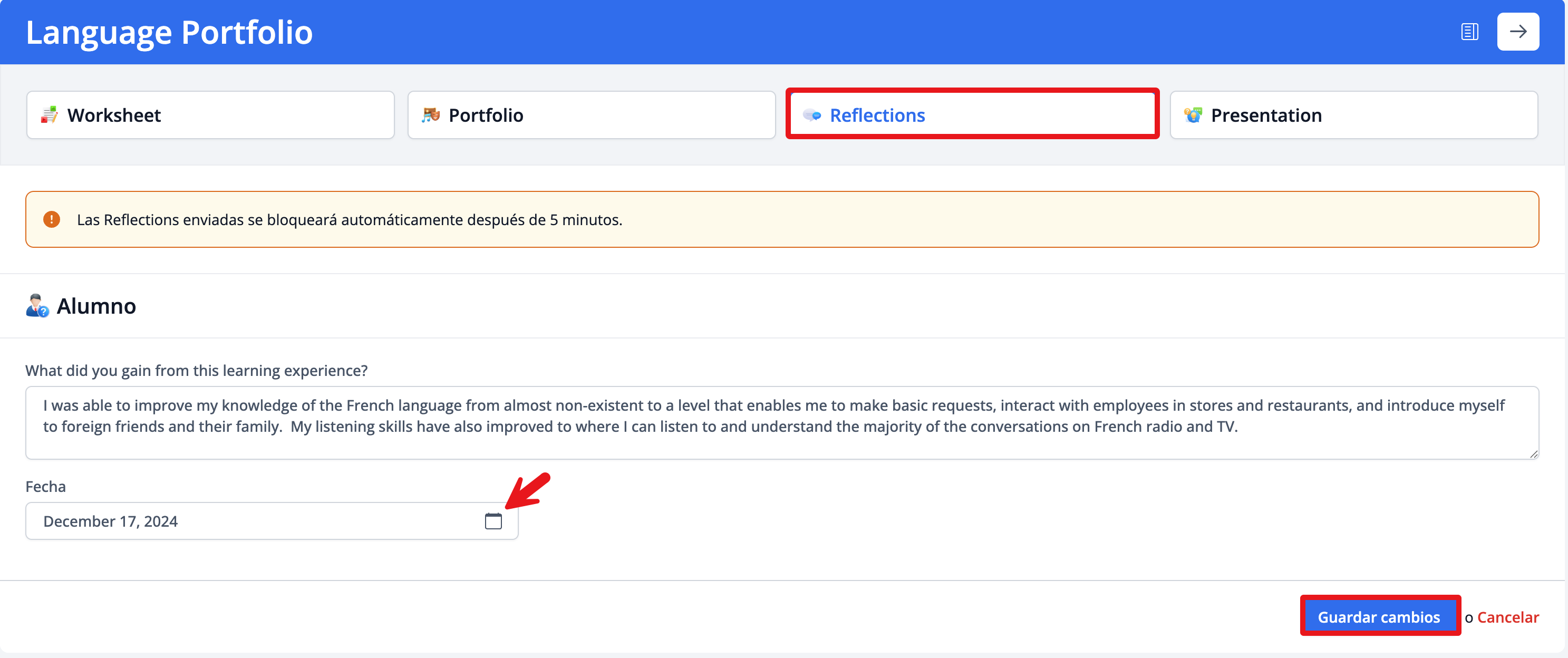 La caja de reflexión se bloqueará 5 minutos después de que hayas terminado de escribir y hagas clic en “Guardar cambios”.