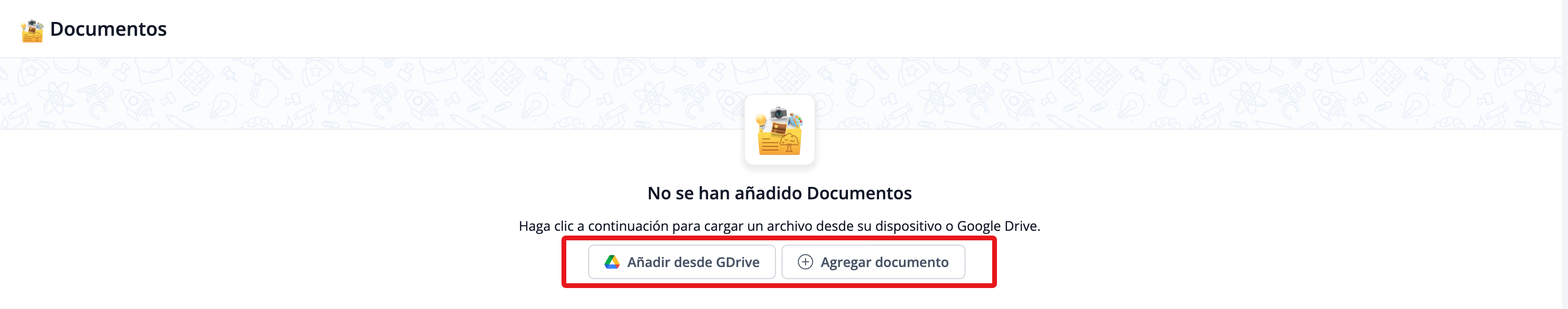 También puedes enviar tus esquemas, borradores y versiones finales en la sección de Documentos. Puedes subir un archivo desde tu computadora usando el botón “Agregar documento” o, si tu colegio tiene habilitada la integración con Google Drive, puedes añadir archivos desde tu cuenta usando el botón “Añadir desde GDrive”.