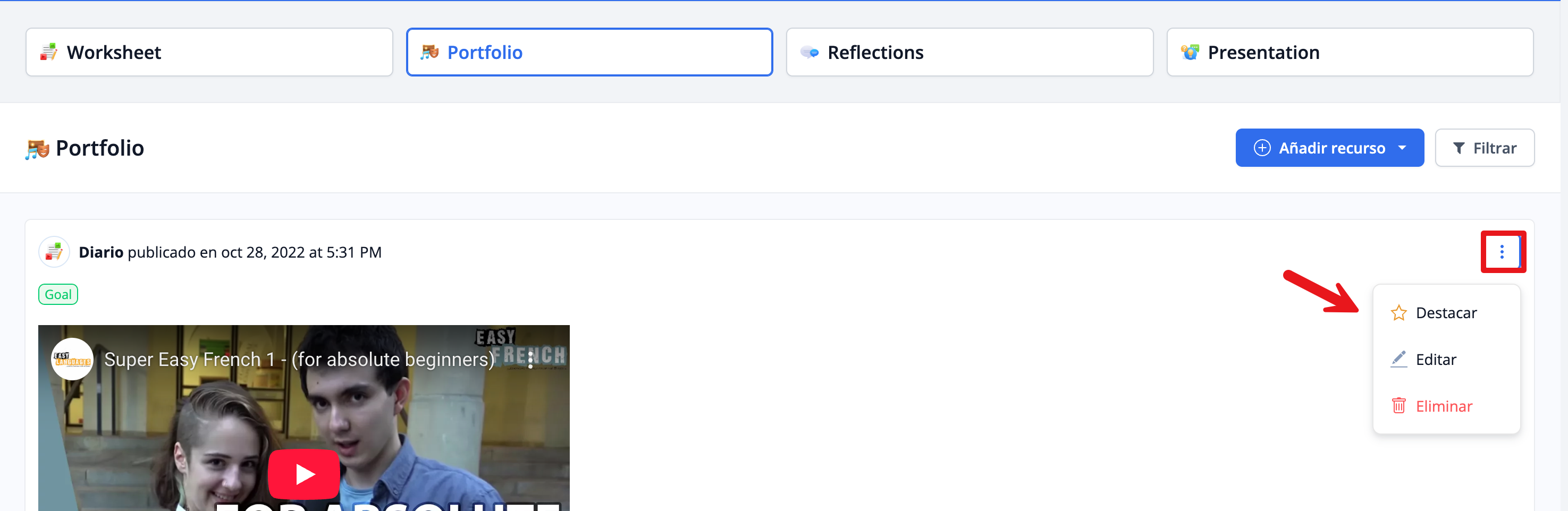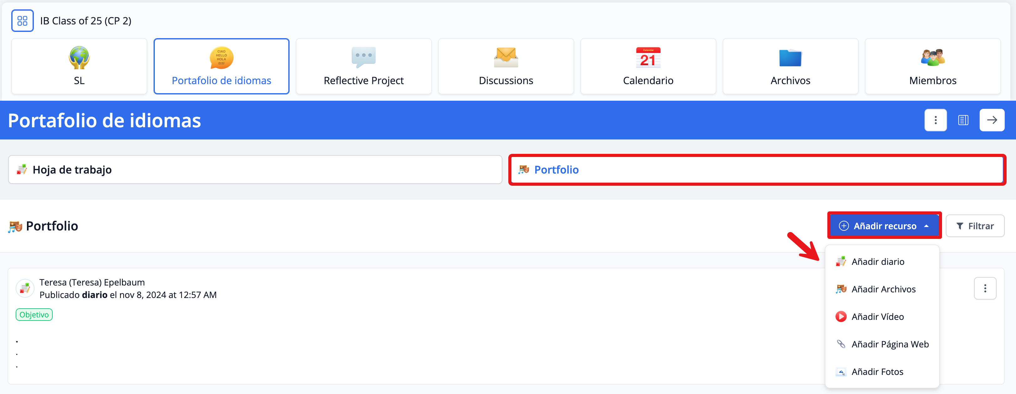 Haz clic en el botón “Añadir recurso” para desplegar un menú, donde podrás seleccionar el formato de tu entrada. Puedes elegir entre una variedad de medios, como videos de YouTube, imágenes y entradas de diario. Una vez que hayas escrito y/o subido tu entrada, haz clic en “Agregar entrada” para guardarla.