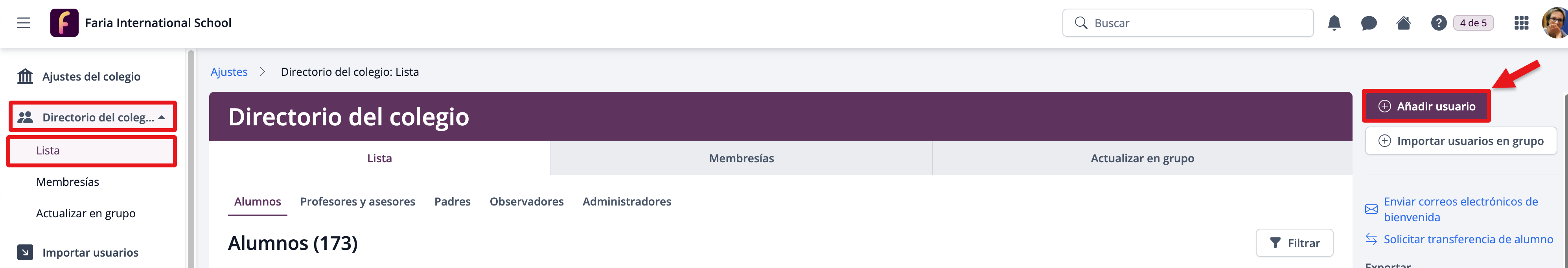 Vaya a Ajustes > Directorio del colegio, pulse Añadir usuario.