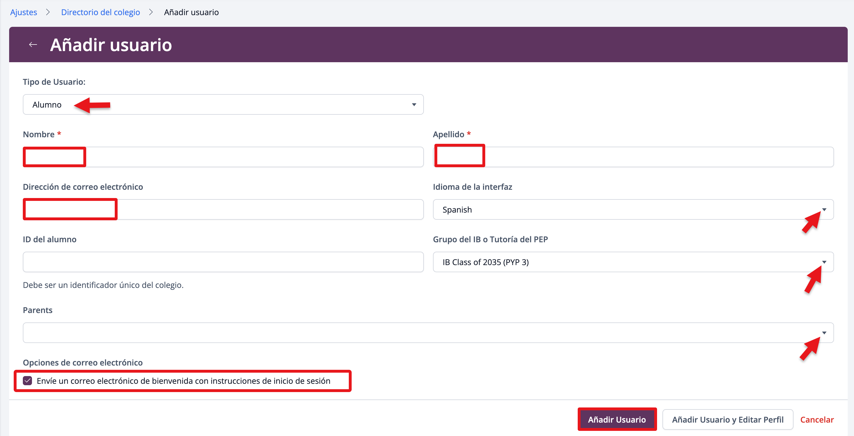 | Student E-mail | Obligatorio. El correo electrónico del alumno. Esto enlaza al padre con la cuenta del alumno en ManageBac+. |