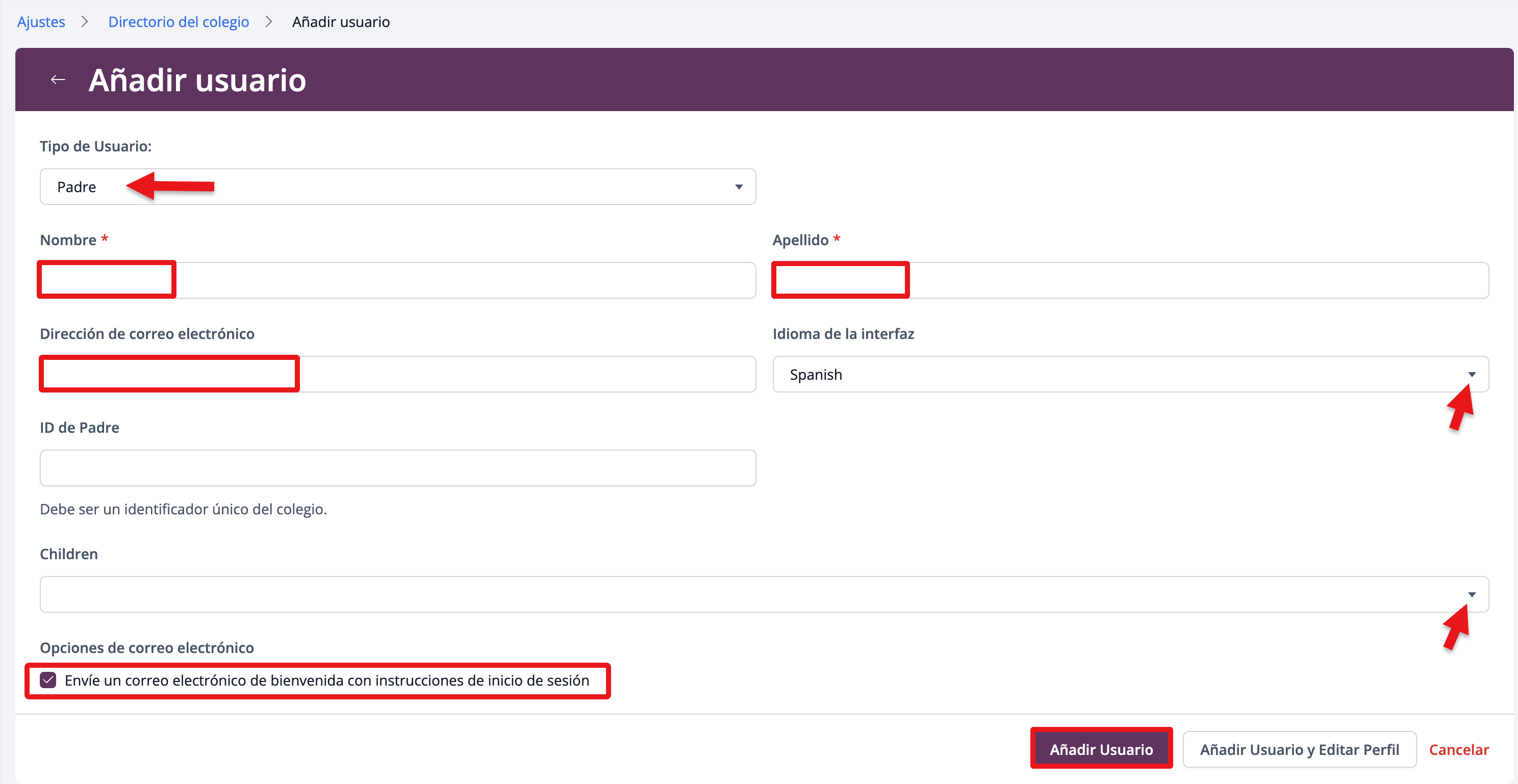 Seleccione Padre en Tipo de usuario y rellene los campos obligatorios.