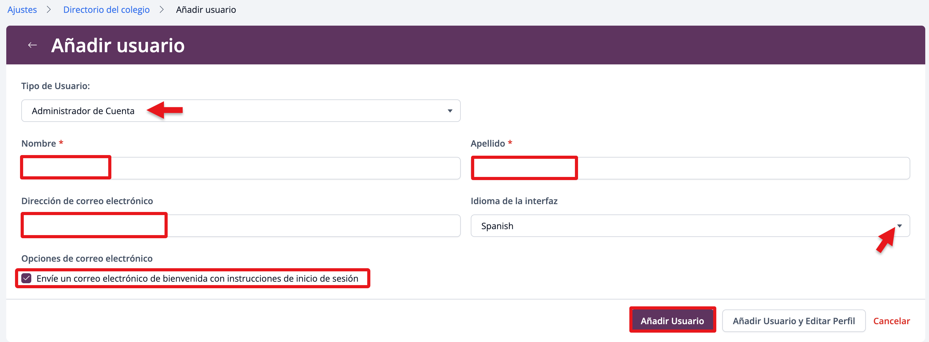 - El Nombre, el Apellido y una Dirección de correo electrónico única* son campos obligatorios, independientemente del tipo de usuario.