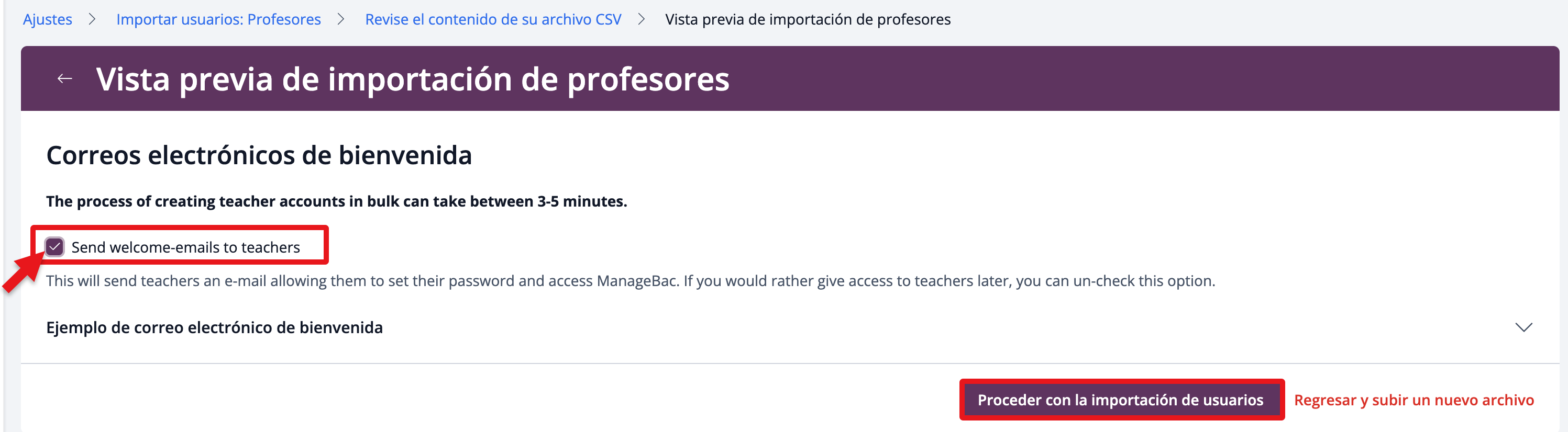 Antes de importar usuarios, confirme si desea enviar emails de bienvenida ahora o más tarde. Recomendamos esperar hasta que el resto de la cuenta esté configurada (por ejemplo, los alumnos y profesores están añadidos a clases) antes de enviar correos electrónicos de bienvenida.