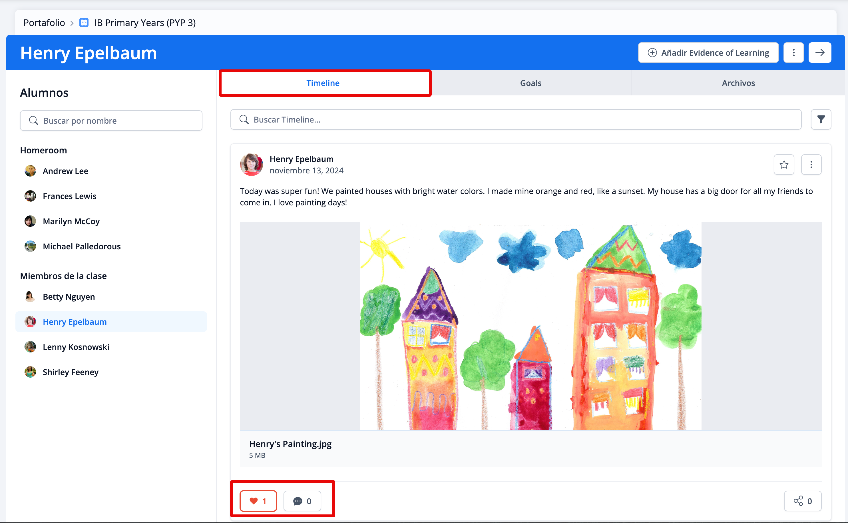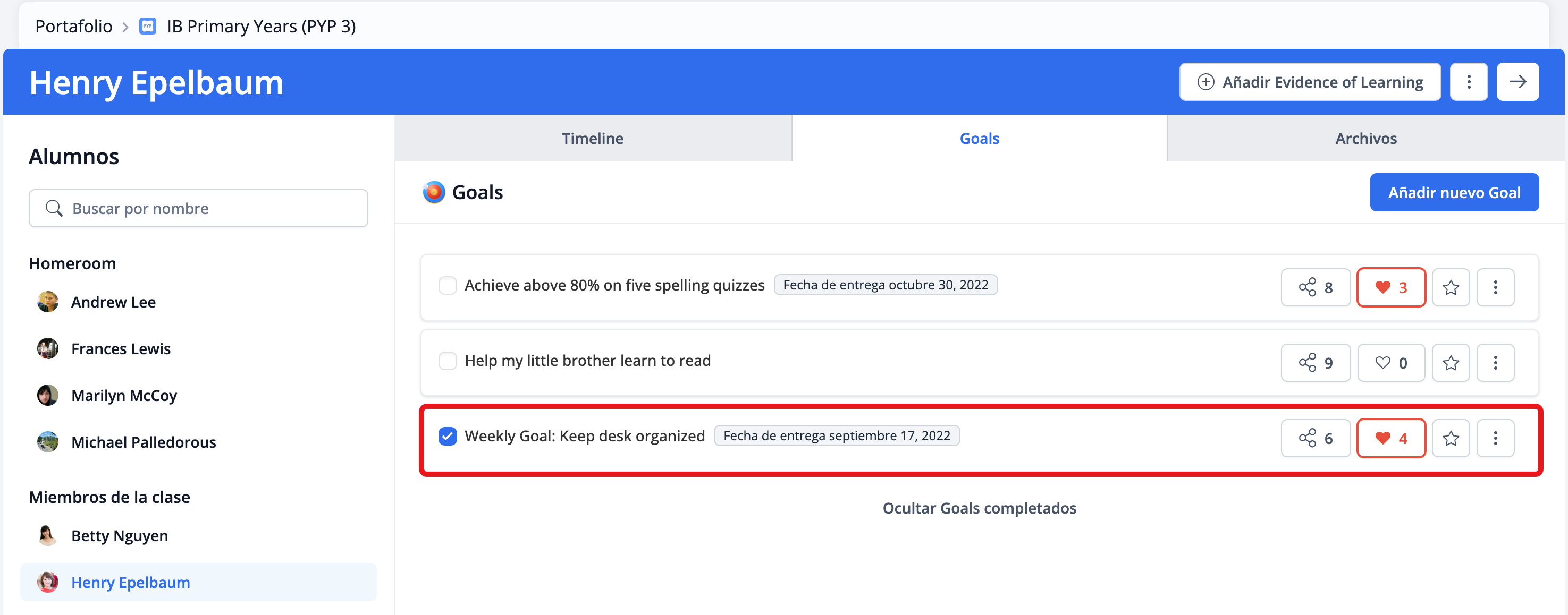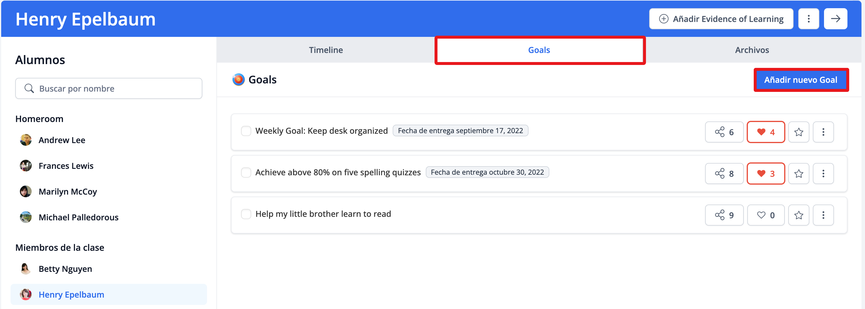 Tanto los docentes como los estudiantes pueden establecer Learning Goals. Los padres, docentes y estudiantes pueden comentar y dar "me gusta" a los objetivos.