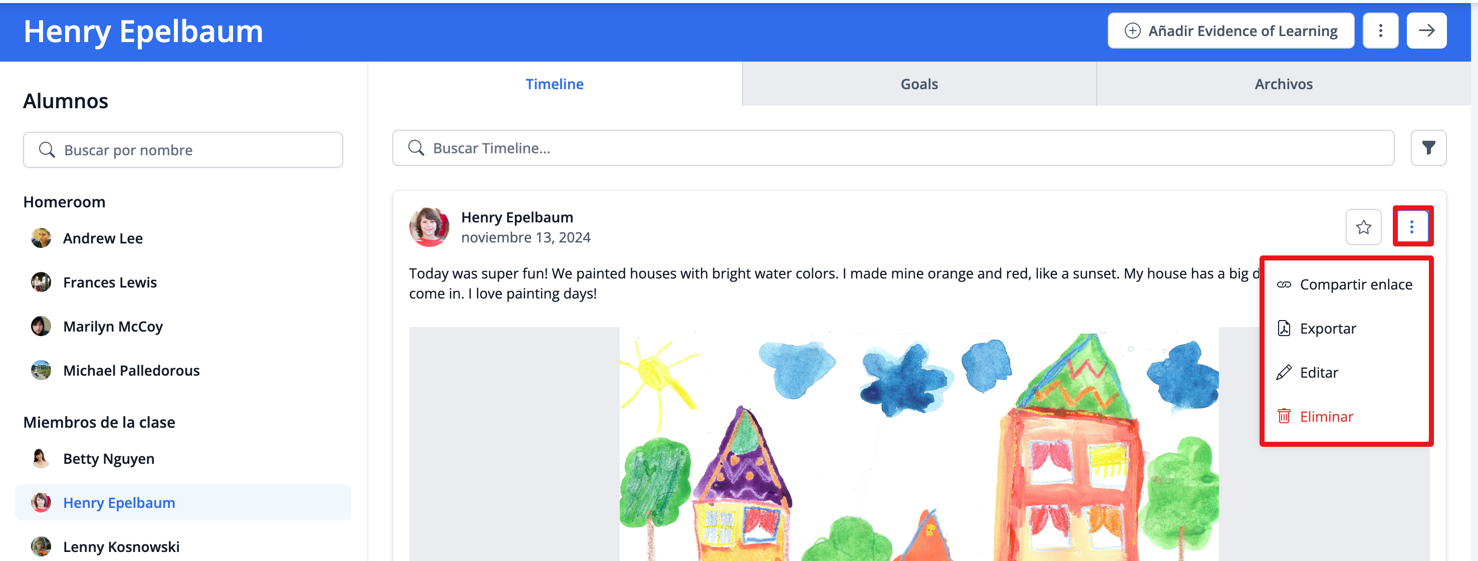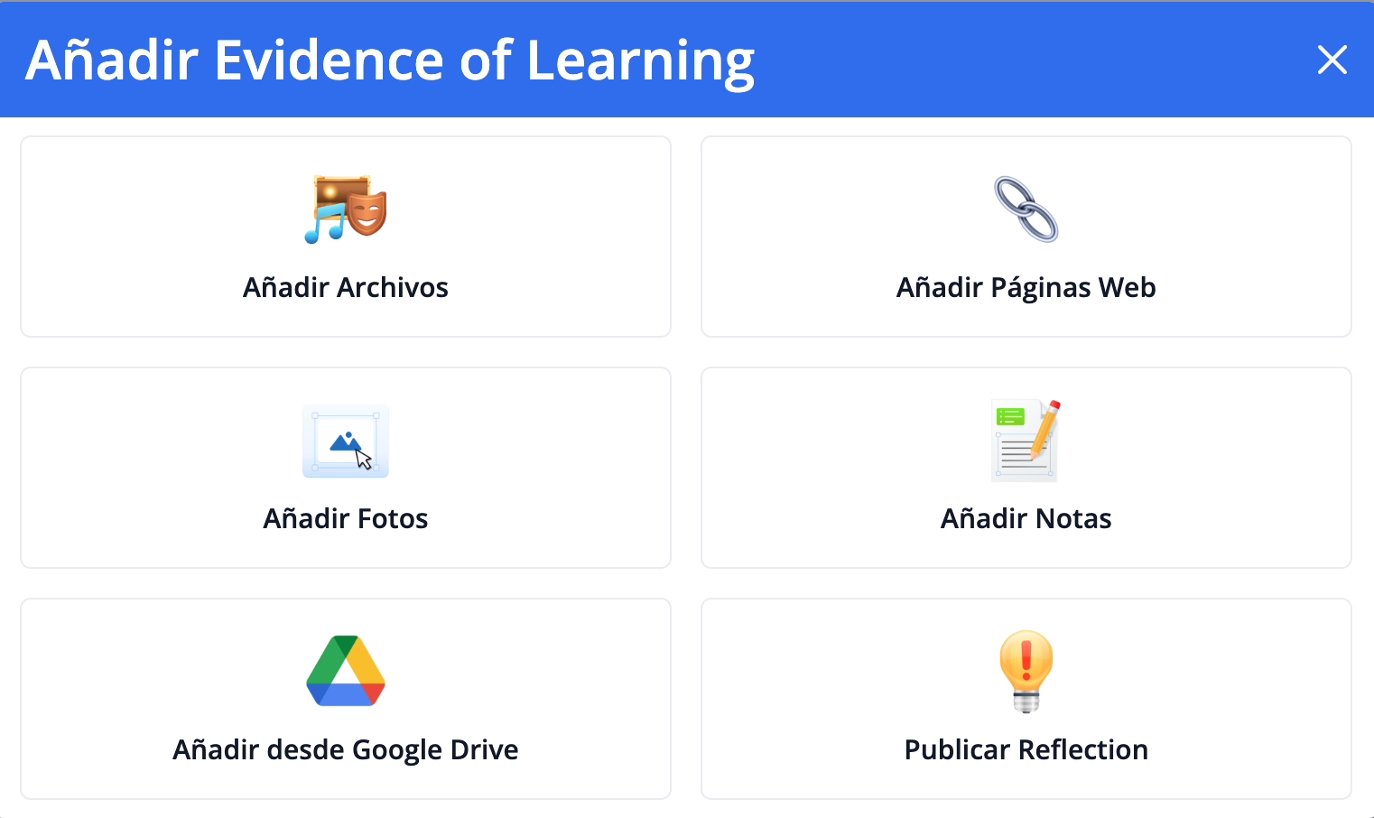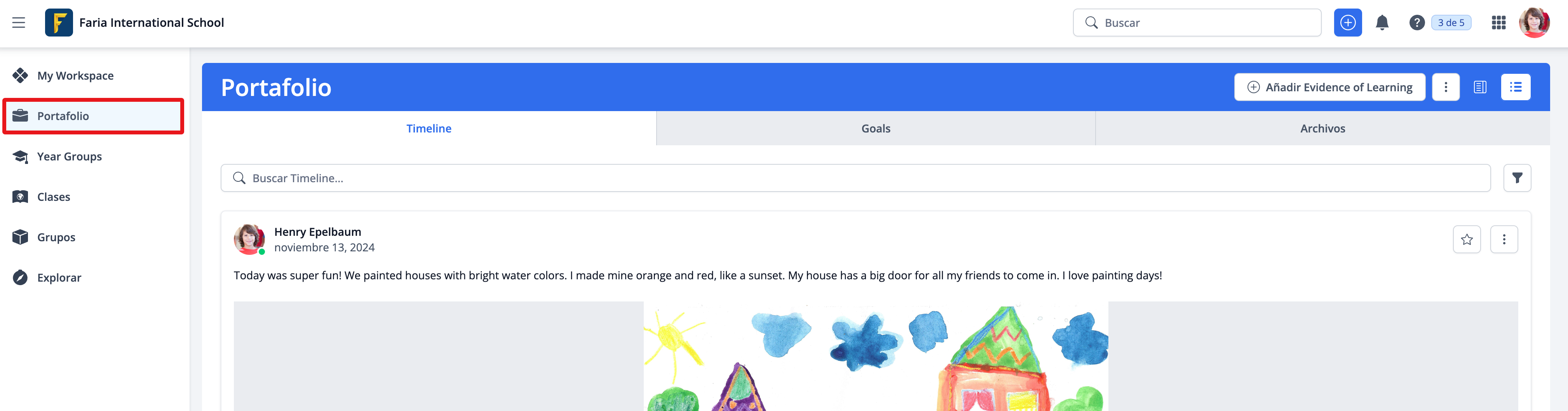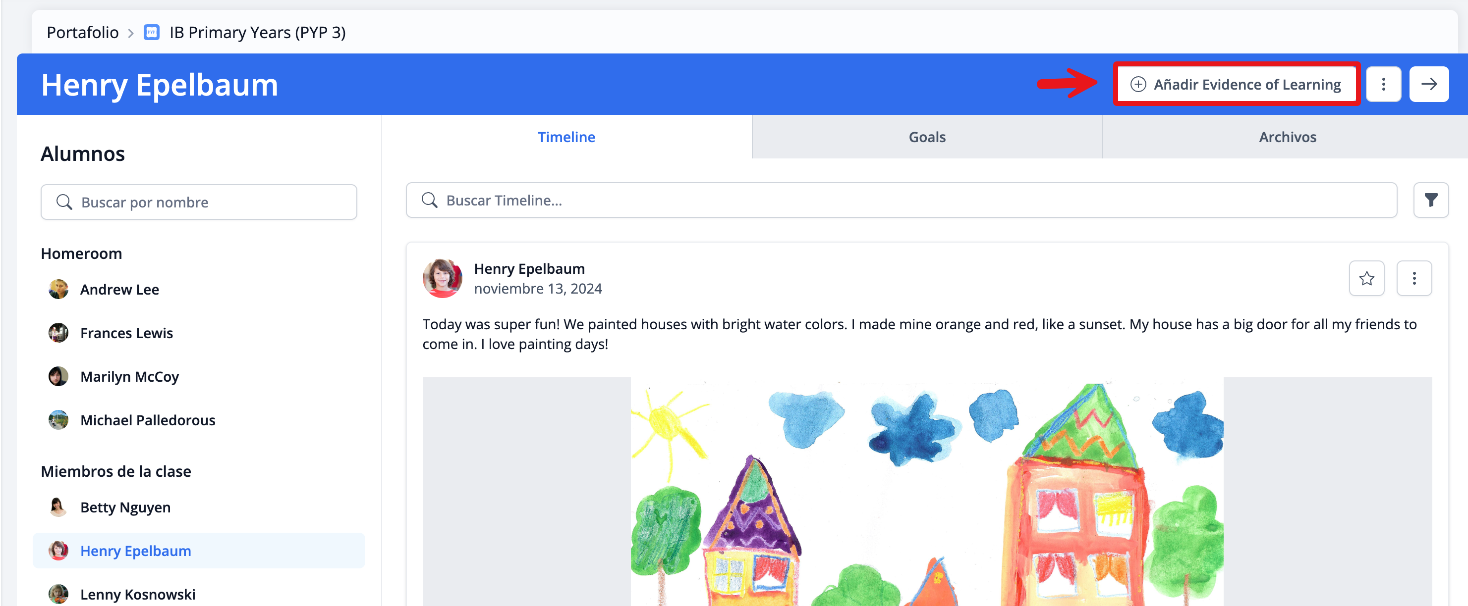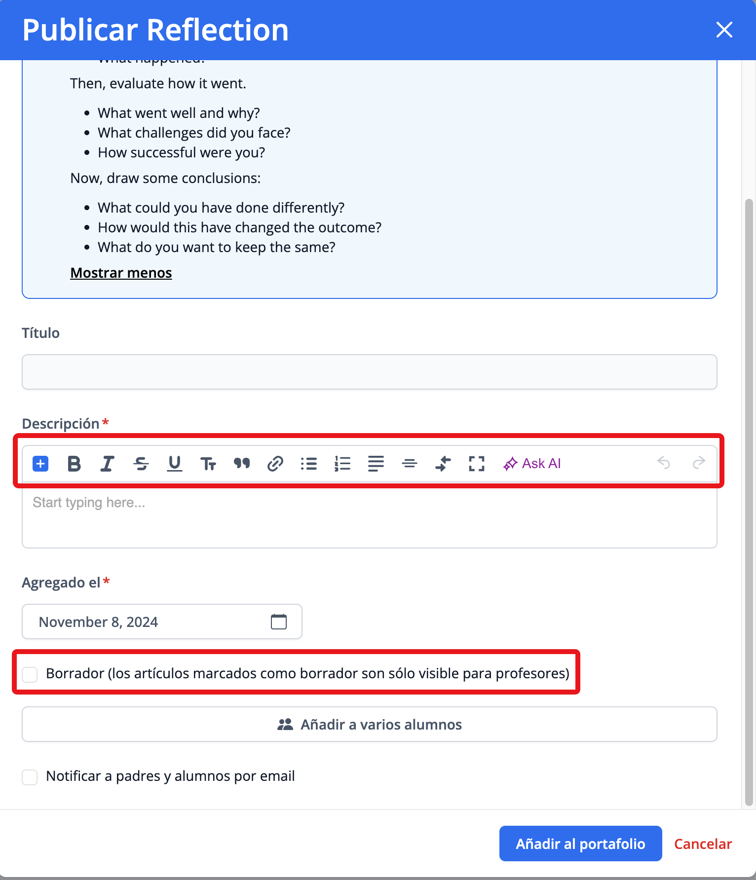 Añadir Evidence of Learning te permite agregar contenido en texto o multimedia para desarrollar el portafolio del estudiante a lo largo de los años.