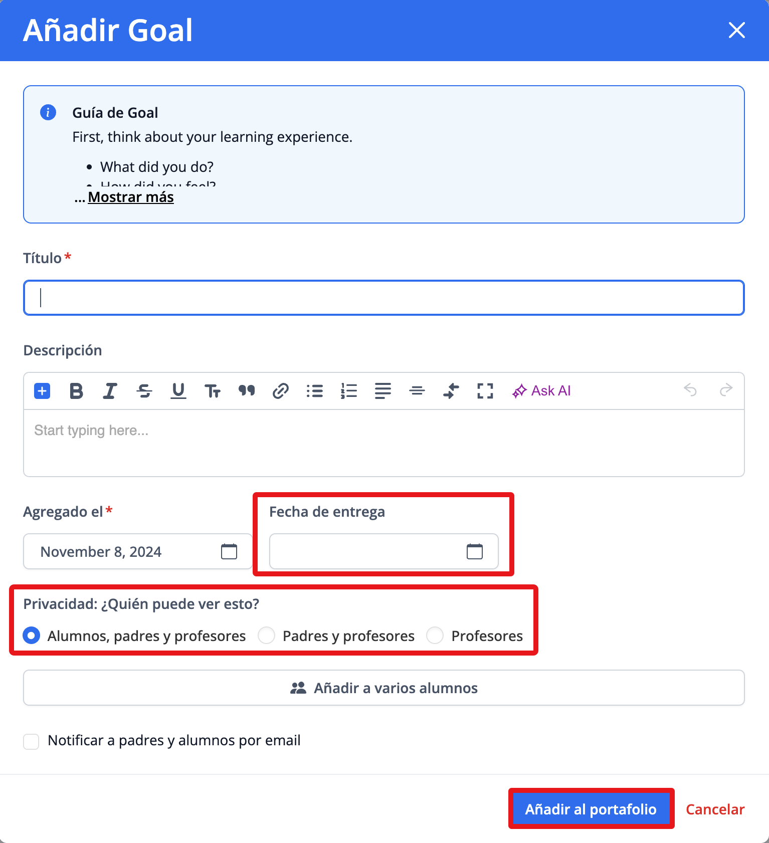 Se pueden añadir Learning Goals para que los estudiantes se los propongan como objetivos, con la opción de marcarlos como logrados y añadir insignias a la línea de tiempo del portafolio. Se puede incluir orientación adicional de forma opcional.