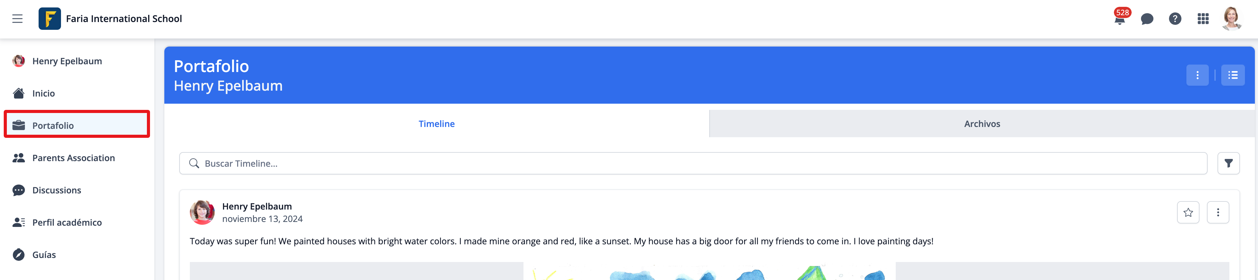 Los padres pueden acceder e interactuar con el portafolio de sus hijos desde el menú lateral izquierdo > pestaña Portfolio. Solo pueden ver el contenido del portafolio de sus propios hijos.
