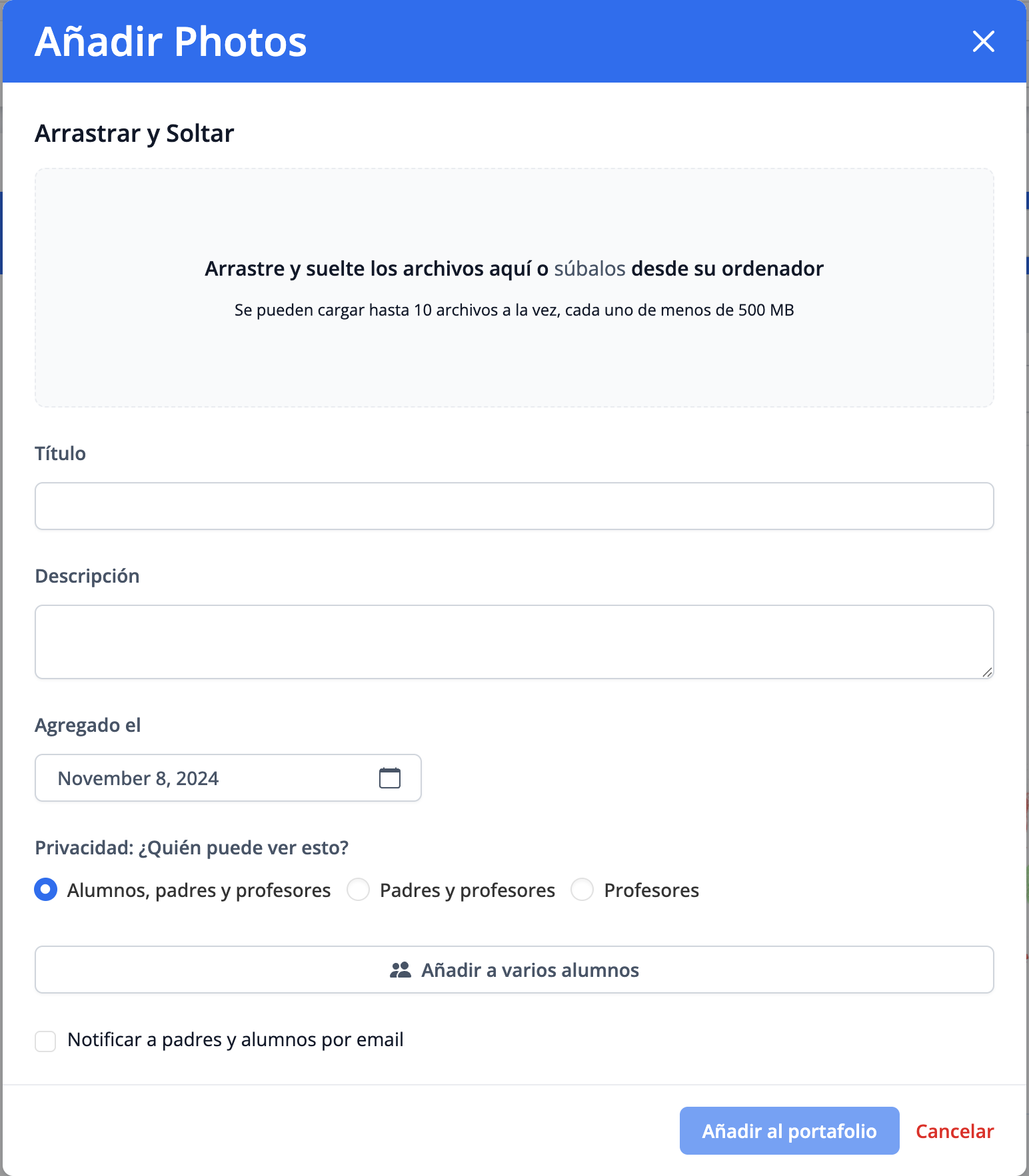 Estudiantes y padres tienen ciertos permisos de acceso para contribuir a la construcción del portafolio del estudiante y fomentar una mayor participación en su proceso de aprendizaje.