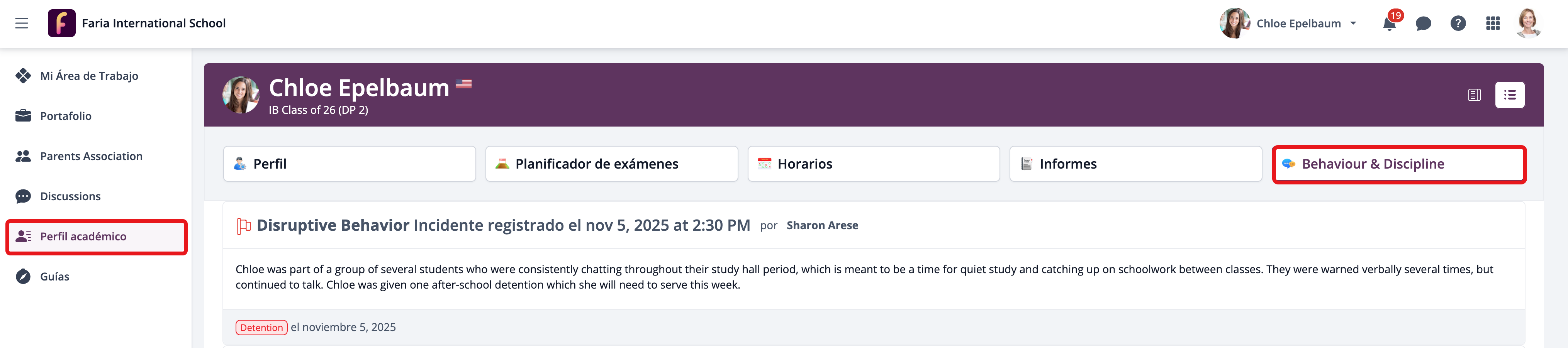 Si se han registrado incidencias del estudiante y se han compartido con los padres, podrá verlas a través del menú de la izquierda Perfil académico > Behaviour & Discipline.
