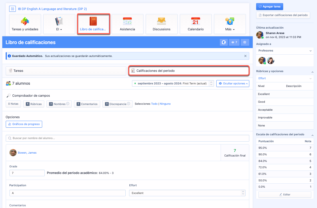 Los profesores deberán ir a la pestaña Libro de calificaciones > Calificaciones del periodo para introducir las calificaciones y los comentarios.