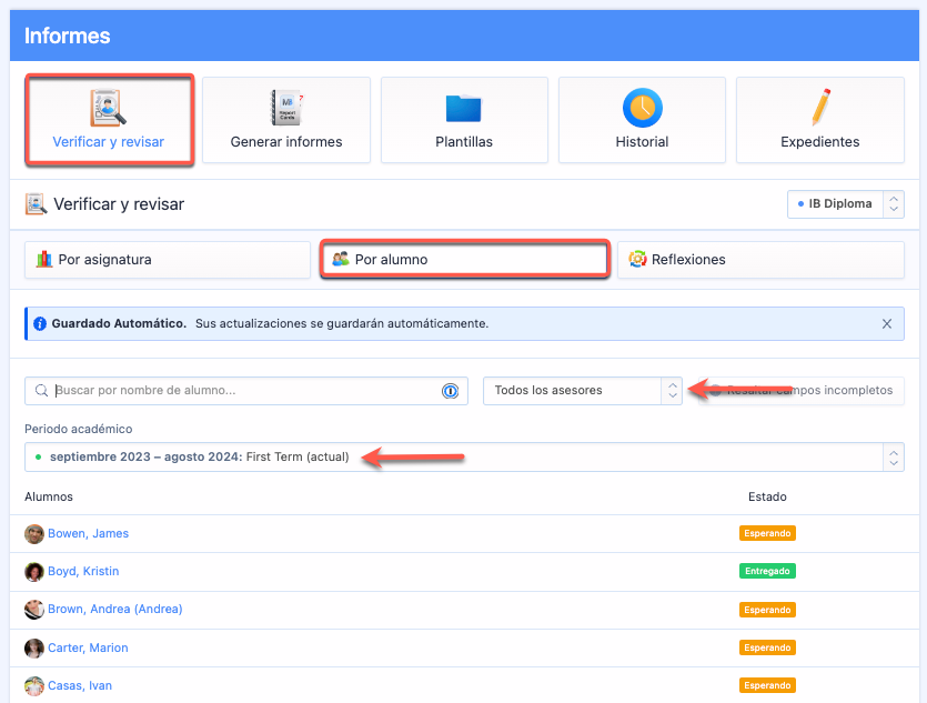 Ve a Verificar y revisar > Seleccionar Programa > Por Asignatura. Desde aquí puedes ver y editar las calificaciones de todas las clases por Asignatura o por Alumno.