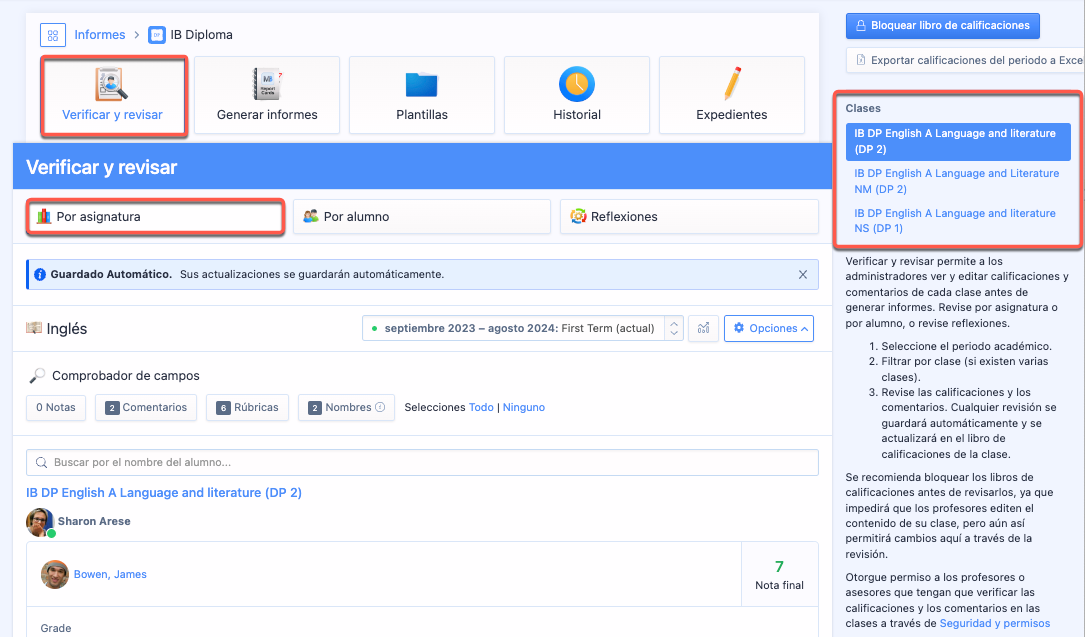 Una vez que las calificaciones y los comentarios se han añadido a las clases, los administradores y profesores con acceso a Verificar y revisar pueden revisar los libros de calificaciones.