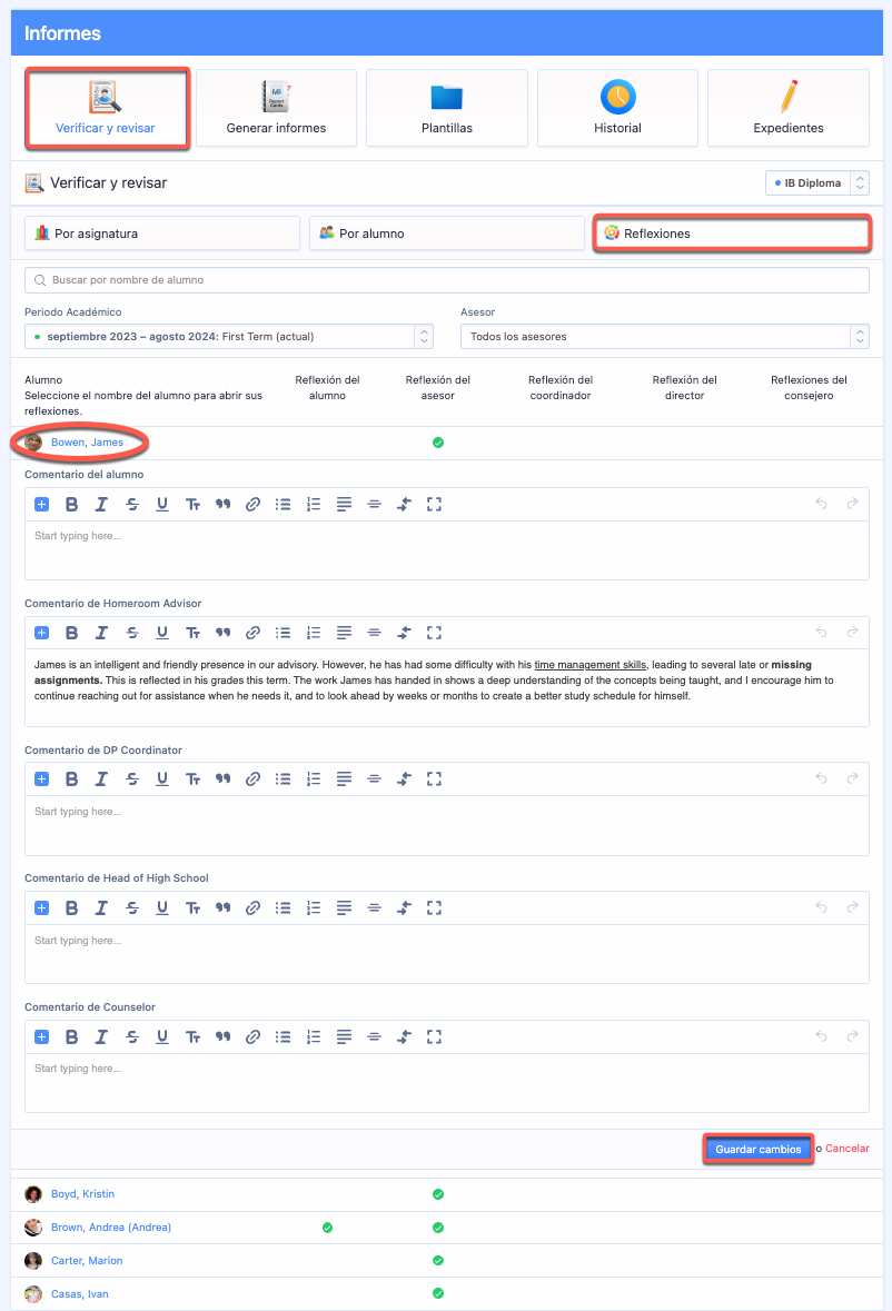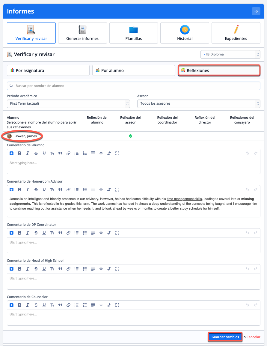 Pulsa la pestaña Reflexiones para leer y editar las reflexiones del Estudiante, el Asesor de aula, el Coordinador, el Director de la escuela o el Consejero. Estas reflexiones pueden habilitarse en el boletín de notas a través de la pestaña Resumen de la plantilla de informe (véase más abajo).