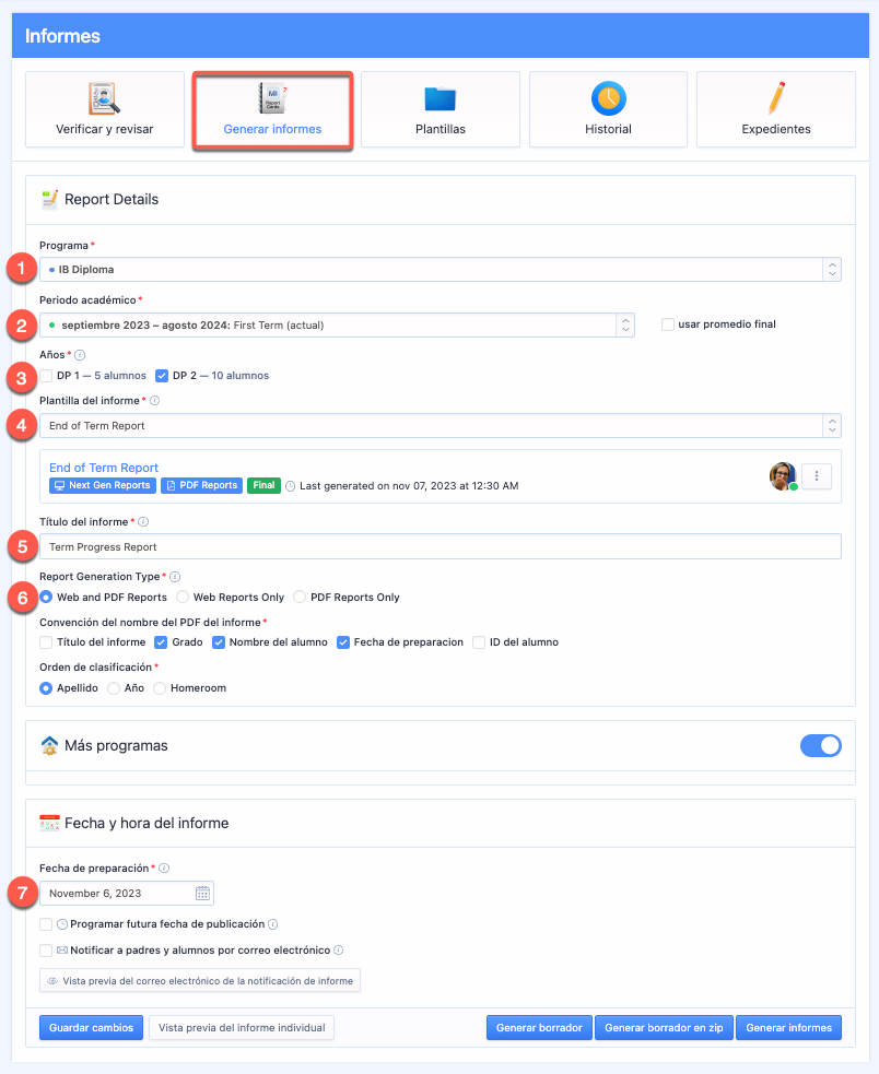 - Tipo de generación del informe: Esto determinará si los estudiantes y los padres están viendo una versión PDF almacenada en el perfil del estudiante o una versión en línea que se puede descargar por separado. Esto también te permite generar sólo versiones PDF o sólo versiones Web de los informes, o ambas. Todas las opciones con informes "PDF" mostrarán los botones "Generar borrador" en la parte inferior de la página.