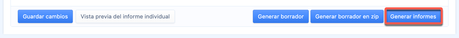 Generar Borrador: Pulsa esta opción para generar informes borrador para todos los alumnos y clases del curso seleccionado. Los borradores se pueden encontrar en la pestaña Historial de Informes del menú de la izquierda. Esta opción sólo aparece cuando se incluyen informes "PDF" en el "Tipo de generación de informes" seleccionado.