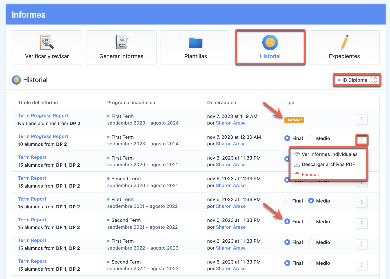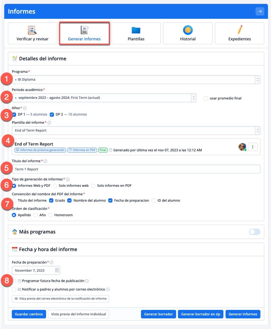 - Programa: Asegúrate de seleccionar el programa del Diploma del IB para los informes de calificaciones del IB PD.