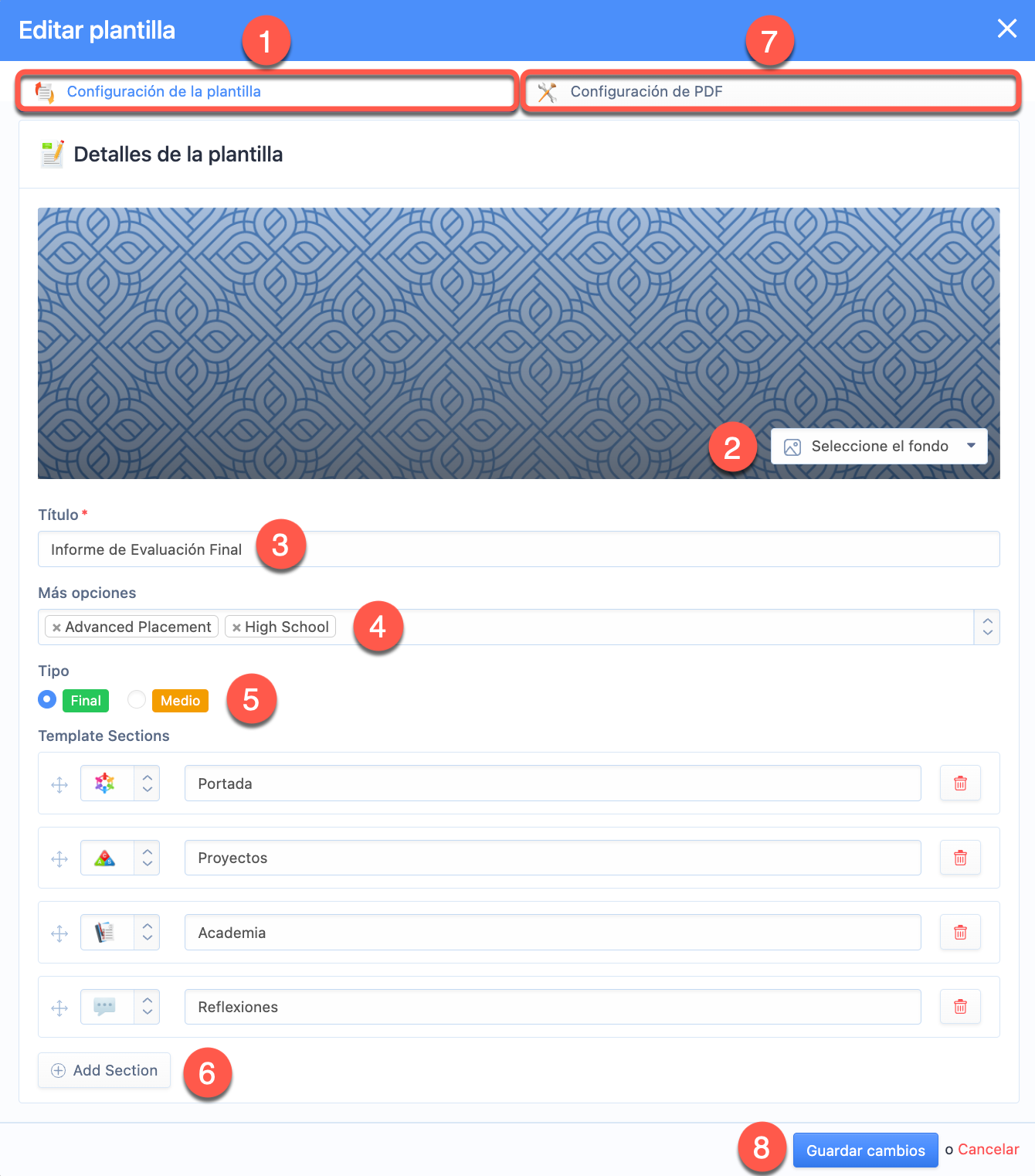 - La configuración de la plantilla: Esto permite a las escuelas establecer configuraciones de plantilla y secciones que son los bloques de construcción básicos de las plantillas de informes web.